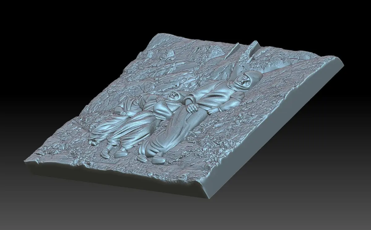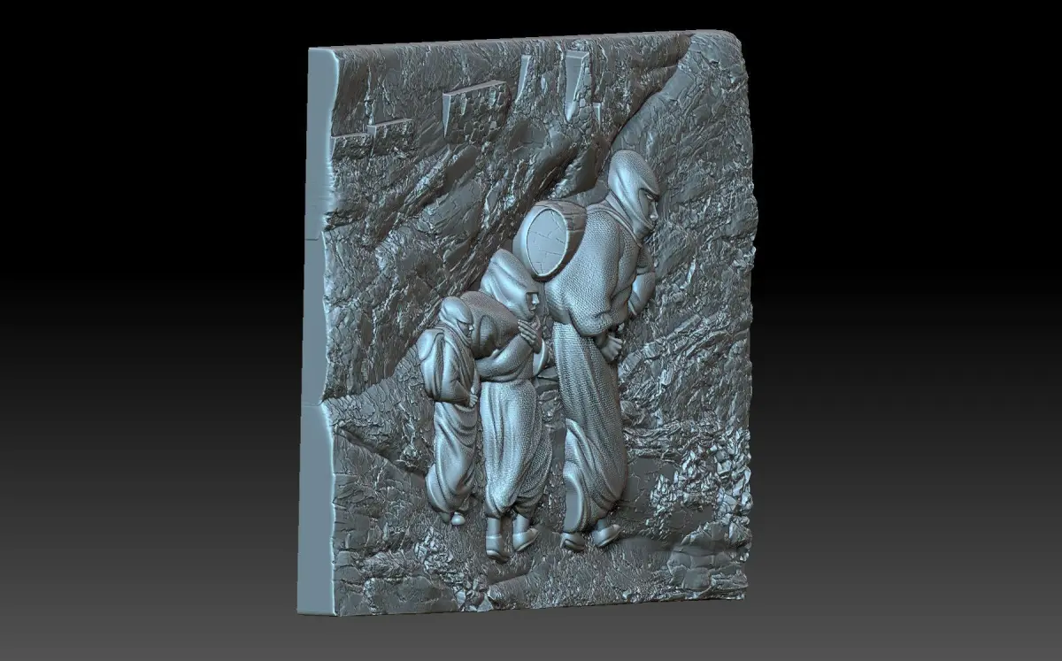 a 3D model of a bas-relief depicting compositions where three women walk along a path in the mountains and carry bags. The work is suitable for 3D printing and CNC machine tools.