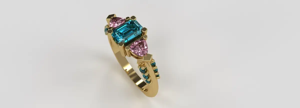 Euro shank ladies diamond ring model. Emerald cut center, trillion and round side stones. Size 7.
