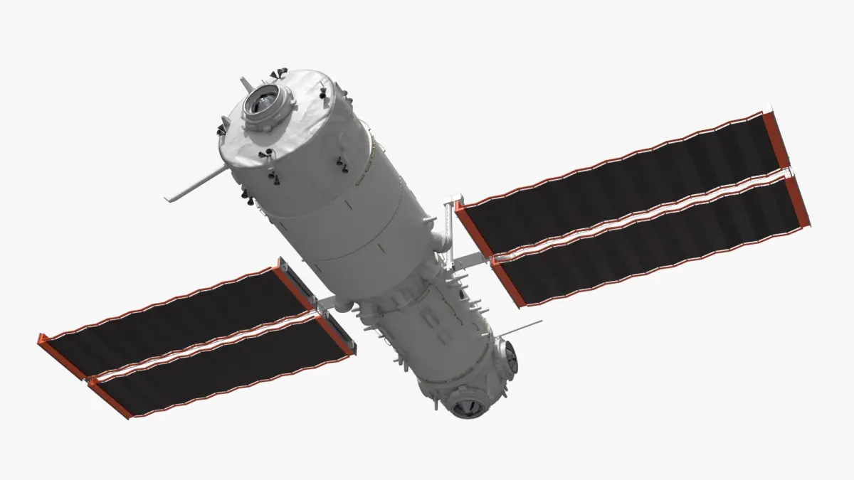 Tiangong Tianhe Main Module with Solar Panels Rigged for Cinema 4D is a 3d model of a space station component, showcasing a cylindrical module equipped with solar panels, designed for long-term space habitation and research.