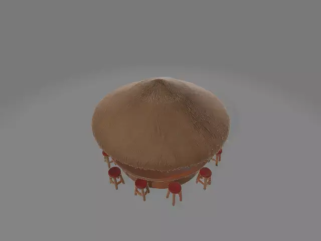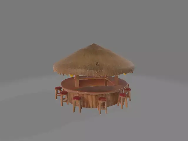 A tiki bar is a small, open bar made of bamboo and palm leaves. It has a wooden counter and bamboo stools. Around it, there are tiki masks and colorful lights. It’s usually located by the beach or poolside.