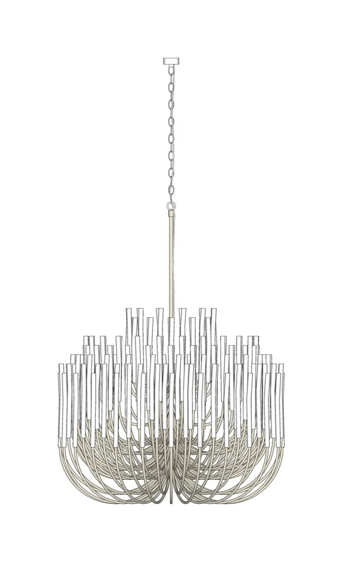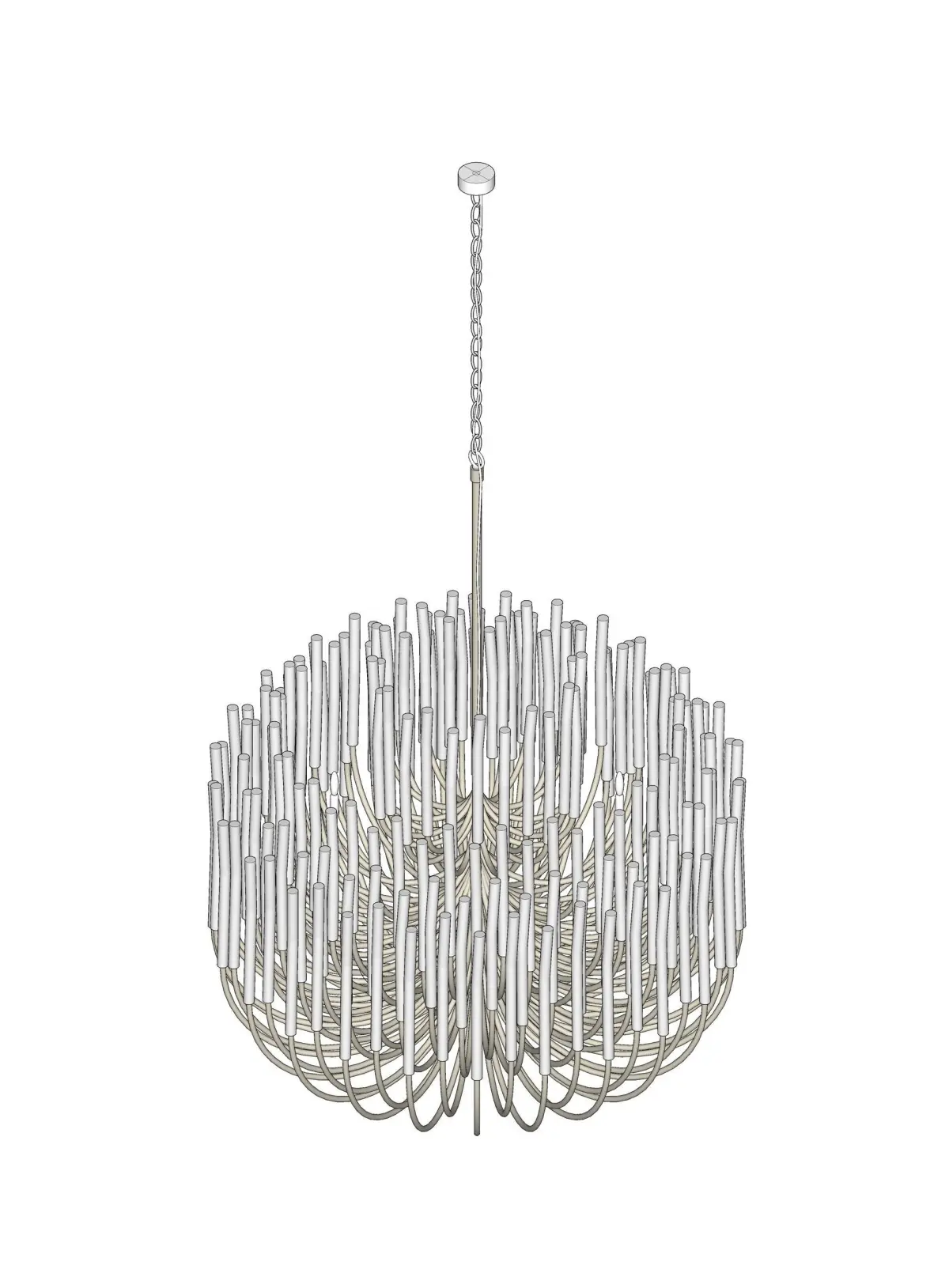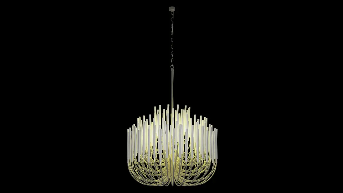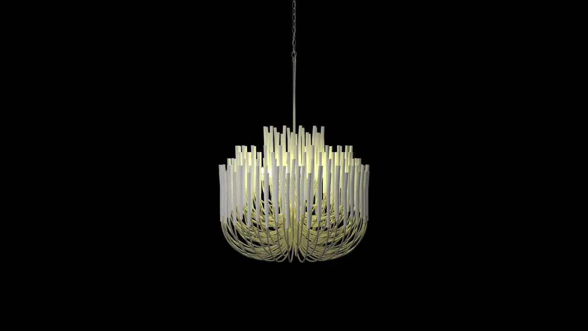 This chandelier model features a 4-tiers as that are comprised of 176 arms that span from the central spine. The lower, middle and upper tier host wooden dowles that stagger up and down around the center. The dowels are made with a slight bend to capture a more dynamic and 'natural' effect in the model. The top tier hosts the finish touch of dowels and in between the top and upper tier are the light-bulb arms of the chandelier. The light-bulb arms are hidden away in the mass of dowels when viewing it from a lower perspective. This helps to create a mystry behind the lighting source and attracts the observers curiosity.