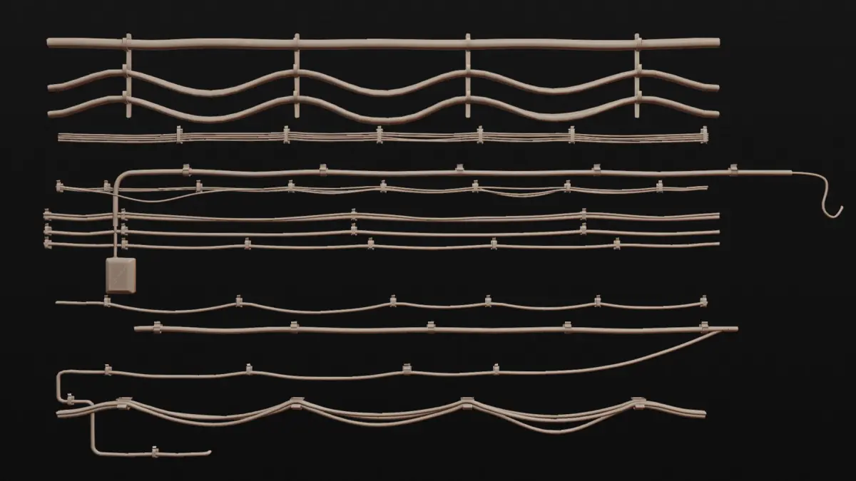 11 model sets of cables/wires for quickly adding detail to walls and ceilings. Wires are tileable and can be copied infinitely to create longer pieces. Provided in obj, fbx and blender files.