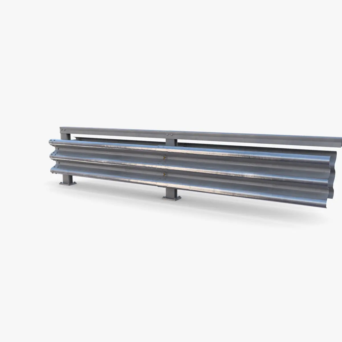 Tileable PBR traffic barrier guardrail 3d model rendered with Cycles in Blender, as per seen on attached images. The model is made in a manner that allows it to be arrayed end to end, thus allowing to make the required length of the barrier as needed.