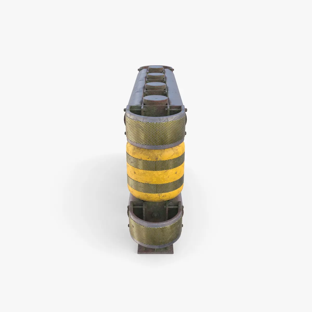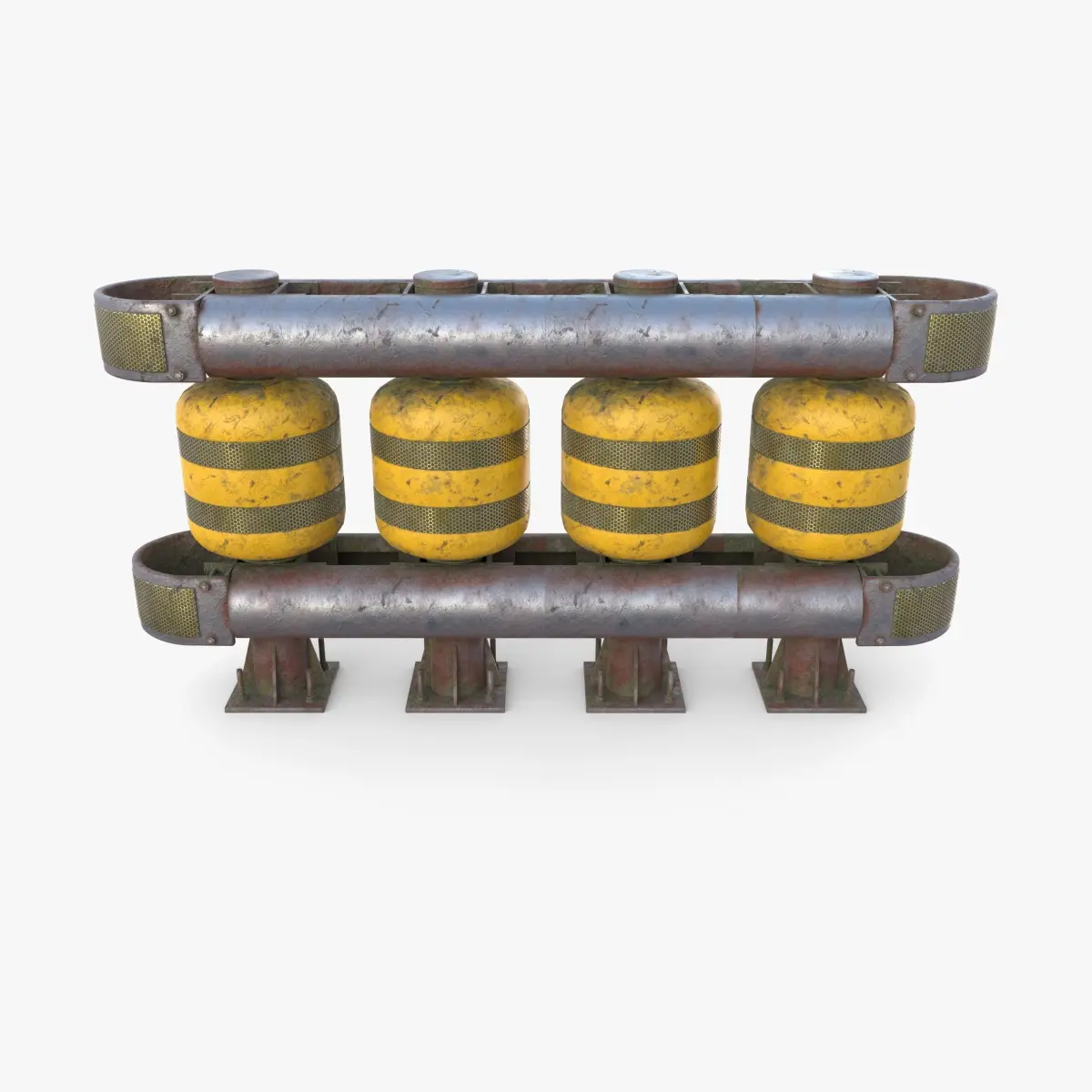 Tileable PBR Rolling traffic barrier 3d model rendered with Cycles in Blender, as per seen on attached images. The model consists of 3 separate objects: two separate end pieces and one tileable middle piece, allowing to make the required length of the barrier as needed.