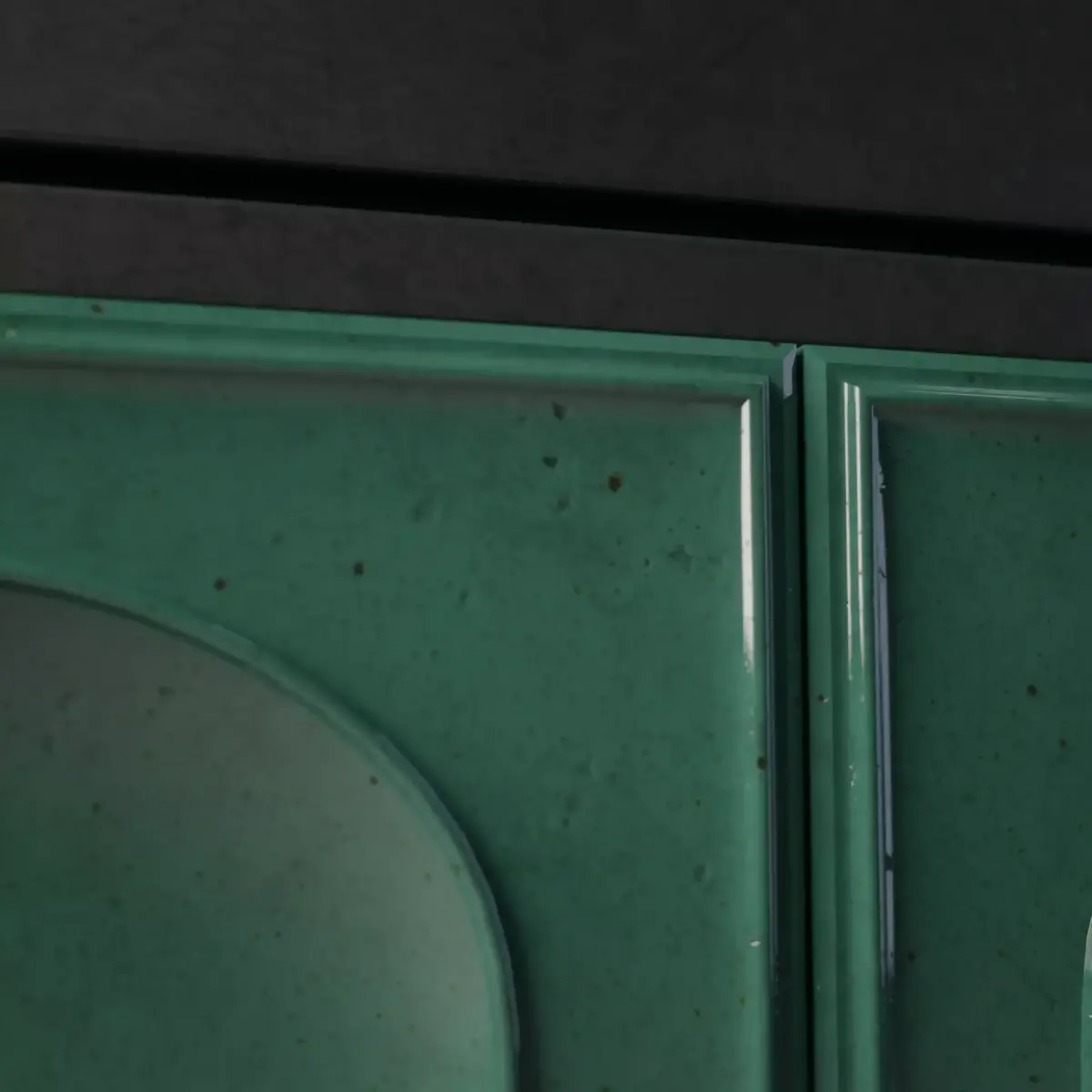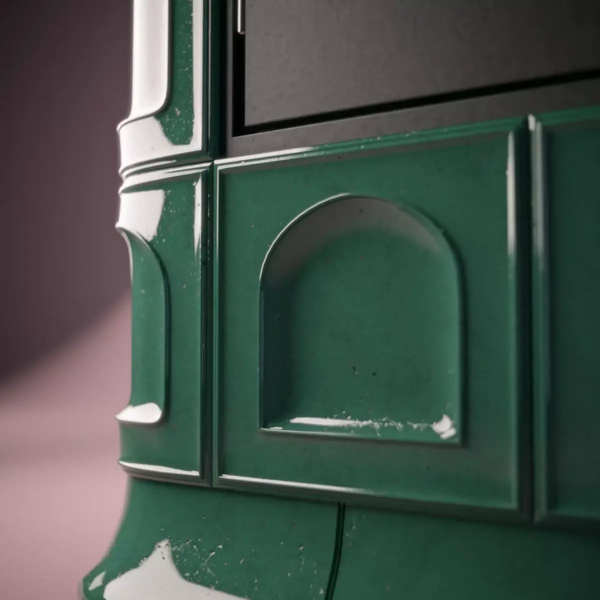 High-quality 3D model of a traditional ceramic fireplace with a glossy green tiled surface and arch-shaped patterns. The model has clean topology, unwrapped UVs and is designed with realistic PBR materials that highlight the reflective glaze and subtle surface details. The front metal door can be opened/closed.