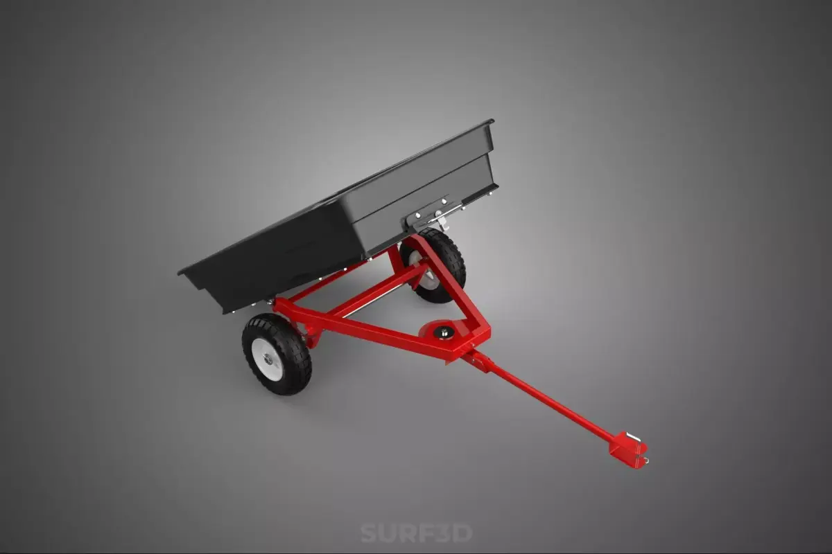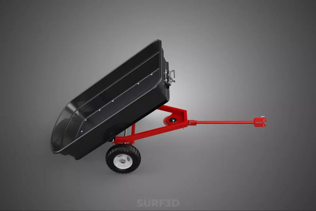 This high-fidelity 3D model represents a versatile utility tow-behind trailer, specifically a tilting bed poly deck cargo cart designed for integration with garden tractors, lawn mowers, and small all-terrain vehicles. The model features a heavy-duty high-density polyethylene (HDPE) tub, which is widely utilized in landscaping and agricultural contexts due to its inherent resistance to corrosion, rust, and impact damage. Unlike traditional metal beds, the poly deck is ideal for transporting volatile or moisture-heavy materials such as fertilizers, damp soil, mulch, and organic waste. The trailer is supported by a robust powder-coated steel chassis, engineered to handle significant weight loads while maintaining structural integrity over rough terrain. Key mechanical elements included in the model are the pivoting tilt mechanism, which allows for effortless gravity-fed dumping, and a universal hitch pin assembly for broad compatibility across various towing platforms. The inclusion of oversized pneumatic tires with deep-groove treads ensures the model reflects real-world flotation capabilities, minimizing turf compaction during operation. This asset is meticulously detailed to serve architectural visualizations of residential landscapes, agricultural simulation projects, and commercial maintenance equipment demonstrations, providing a realistic representation of modern yard management tools.