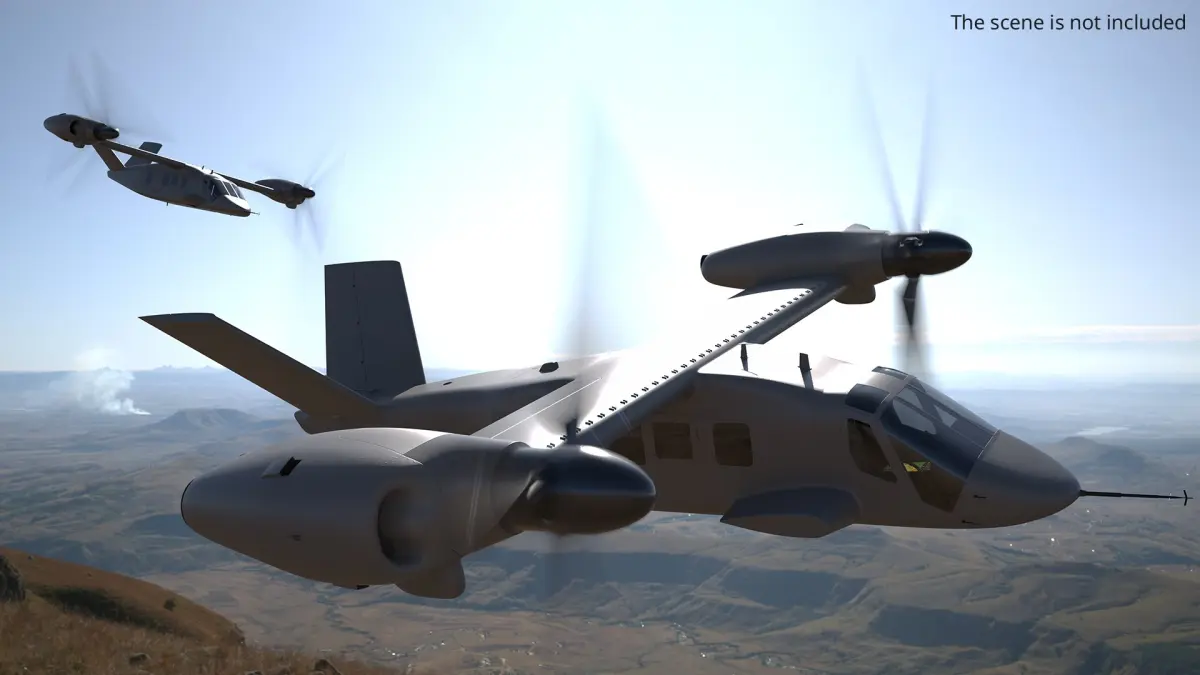 Tiltrotor Transport Aircraft Flying is a high quality, photo real 3d model that will enhance detail and realism to any of your rendering projects. The model has a fully textured, detailed design that allows for close-up renders, and was originally modeled in 3ds Max 2020 and rendered with V-Ray. Renders have no postprocessing!