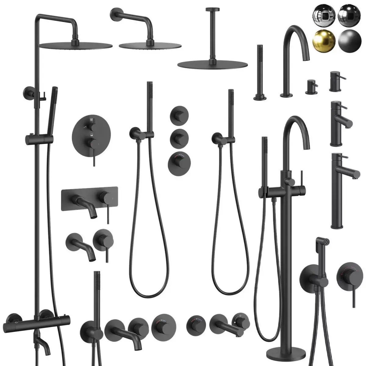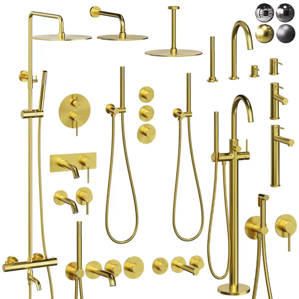 3ds Max faucets are available in 4 colors: chrome, Black brushed, black Matt, gold. If necessary, the metal color can be easily edited by changing the color of the Color Node. Blender and Cinema 4d available in chrome color without labels, the color of the faucets is also easy to change.