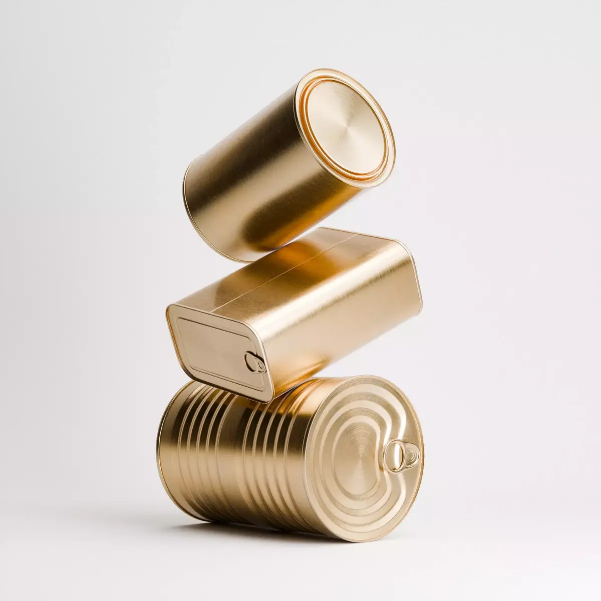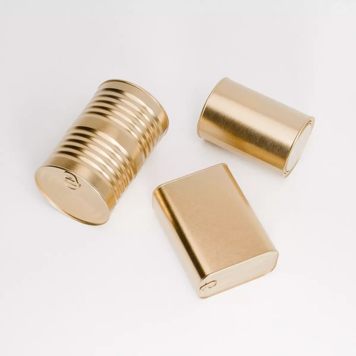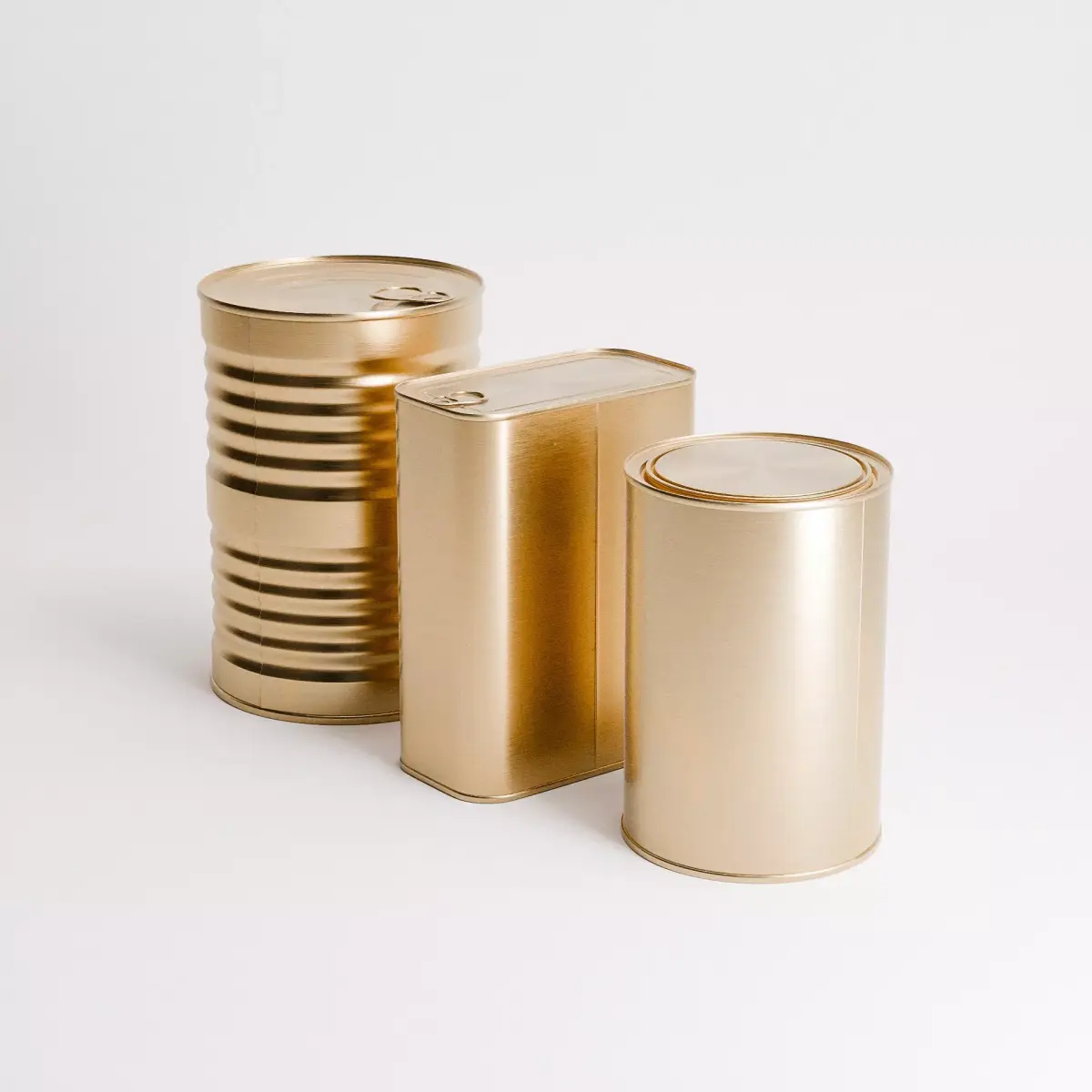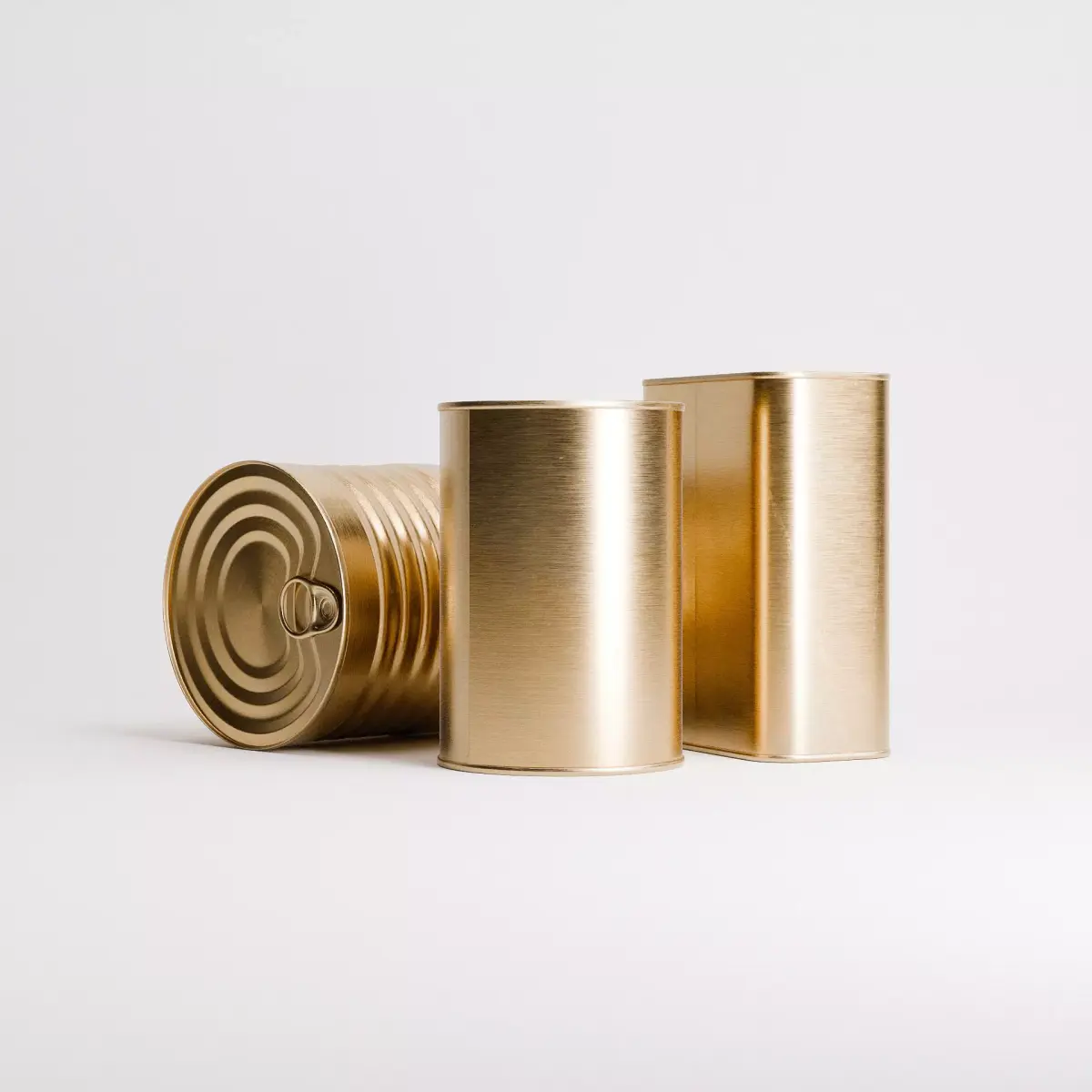 A utilitarian trio of tin cans, each defined by precise commercial geometry and understated industrial presence. The set includes a cylindrical ring-pull can, a taller seamless tin, and a rectangular pressed canister, all unified by crisp edges and consistent proportions. Each vessel is made with clearly delineated seams and gentle surface curvature, capturing the subtle distinctions typical of mass-produced food packaging – ideal for product visualization, retail scenes, or kitchen environment mockups.