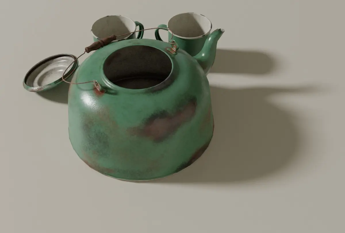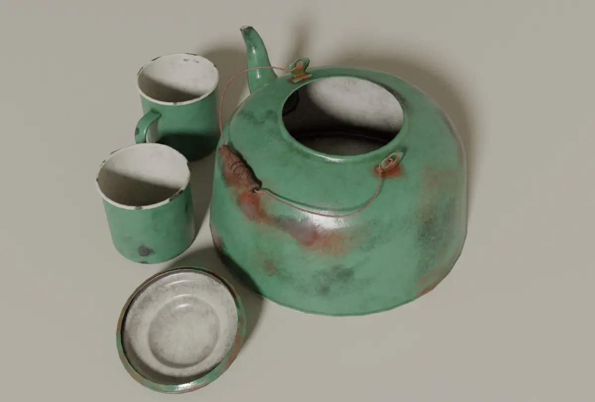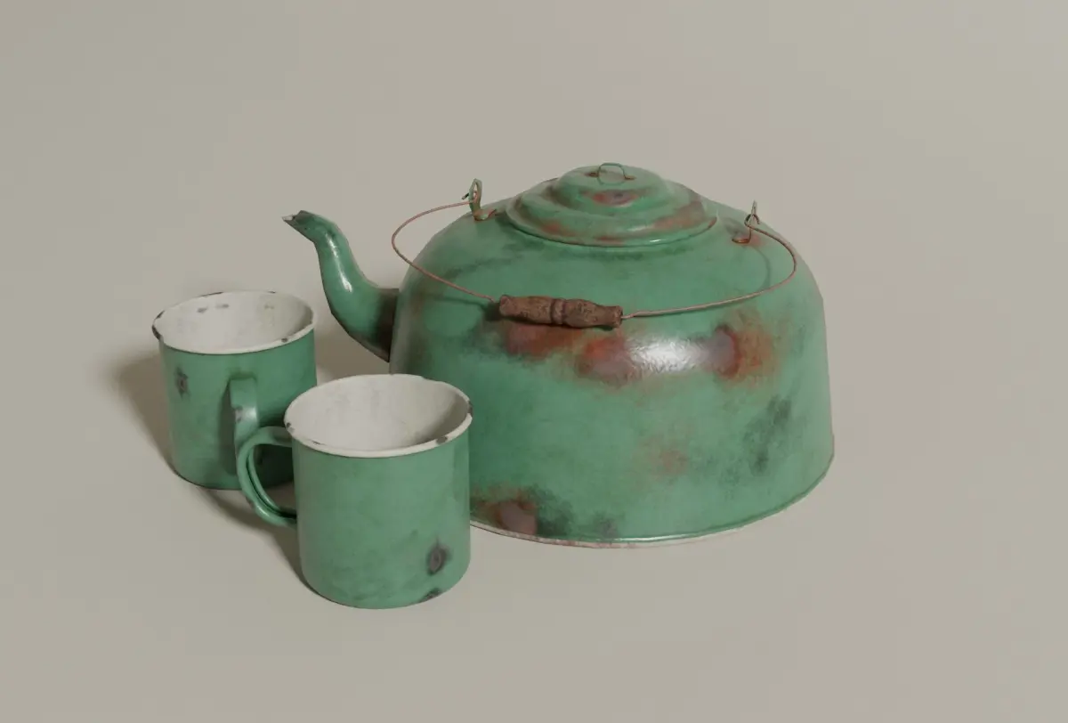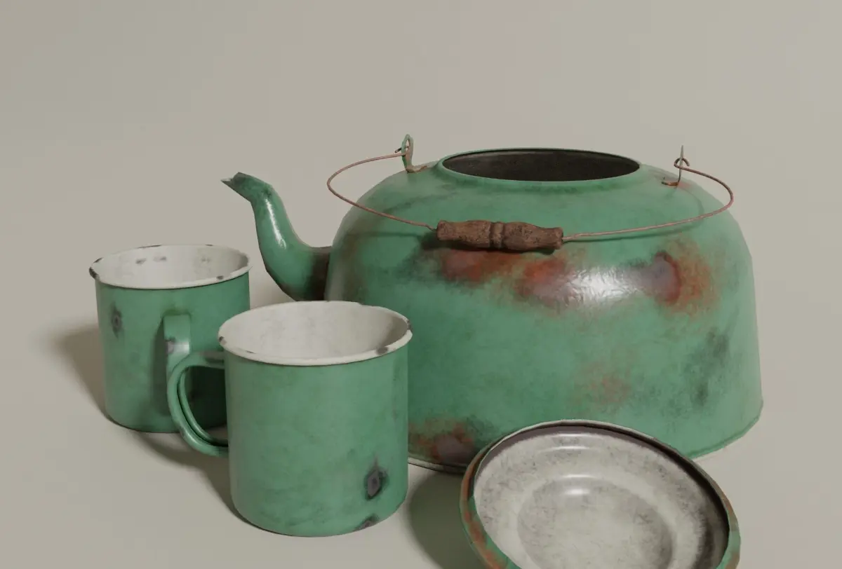 This is a set of enamel kettle and tin cups. Modelled in Blender, textured in Substance Painter.Less than 7000 polygons (kettle + one cup).PBR materials: