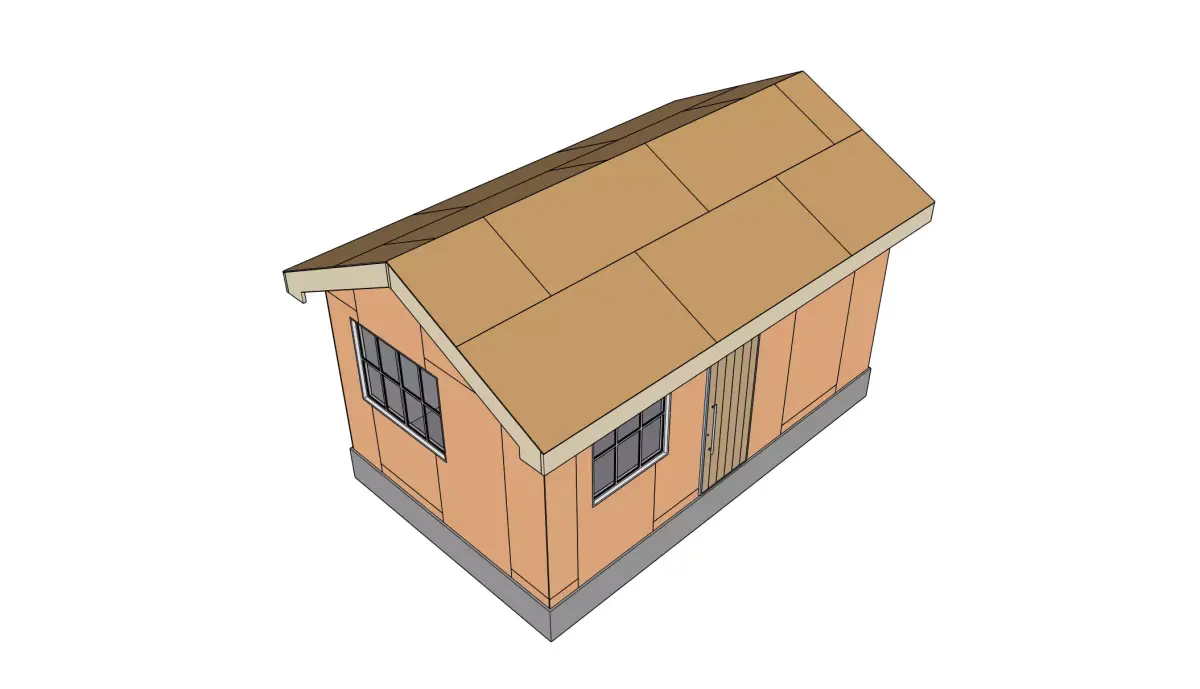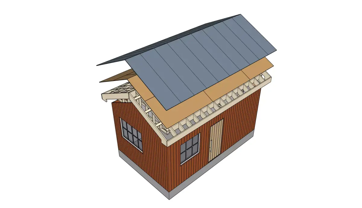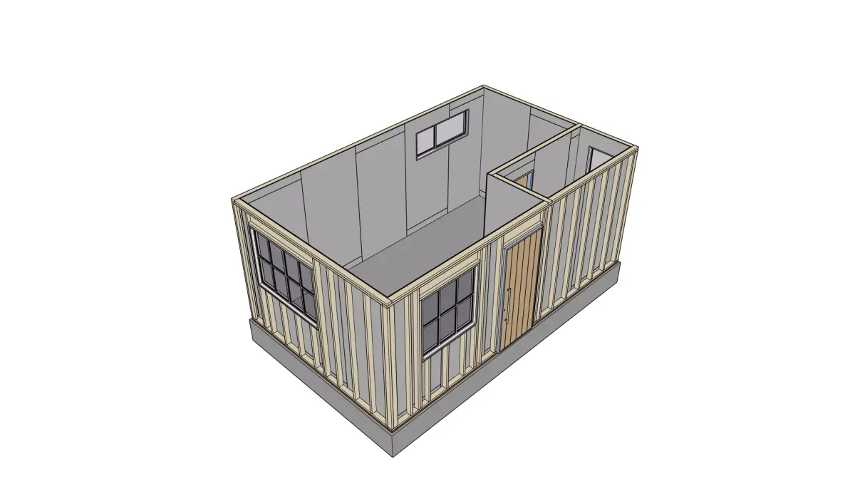Model Components:Foundation: Concrete slab with Pressure Treated Mudsills.Wall Framing: 2x4 Studs (16" O.C. spacing), Double Top Plates, Window/Door Headers.Roof Framing: 2x8 Rafters, Ridge Board, Collar ties/Ceiling joists, Sub-fascia.Sheathing: OSB Plywood (Staggered layout) + Tyvek House Wrap layer.Finish: Exterior Siding (Vertical Wood/Metal style) & Interior Drywall.