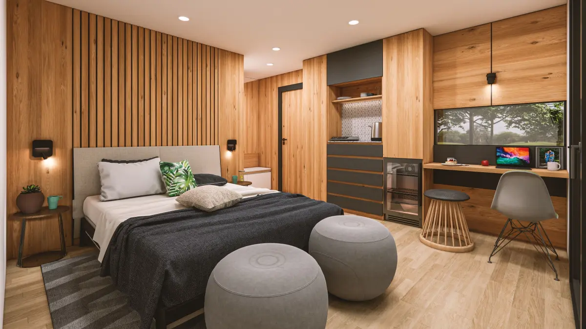 Modern designed Tiny House, glamping pod, vacation house, tiny home. Modern designed home, tiny house, vacation house with fully furnished interior, terrace...Size 4m x5m..20m2. It can be produced , Or you can build it yourselve. Unique designed,modern,highly detailed 3D model with lot of useful 3D models and furniture in it, this model contains house with all the furniture in kitchen, living room/bedroom,bathroom and terrace.
