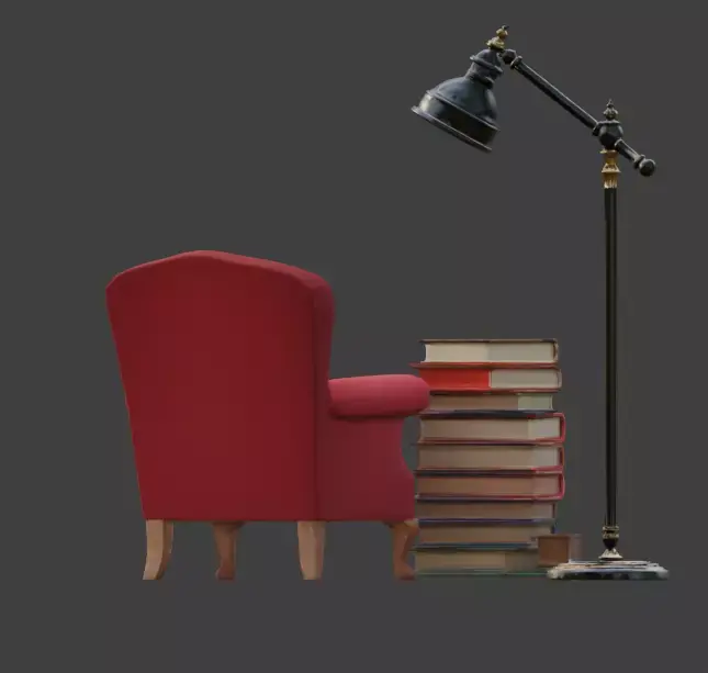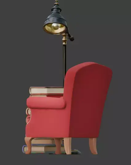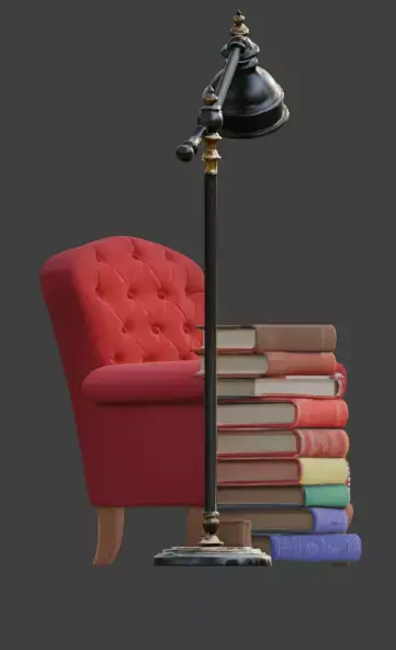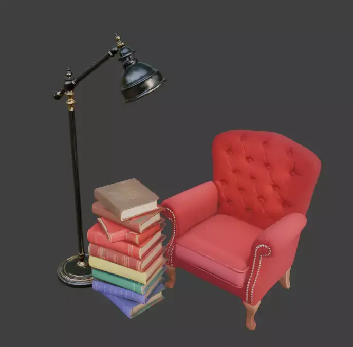 Tags3d model library corner stylized diorama game ready prop velvet armchair colorful books reading nook bookshelf asset warm lighting miniature library whimsical aesthetic office prop study room interior asset isolated prop pbr materials cozy decor
