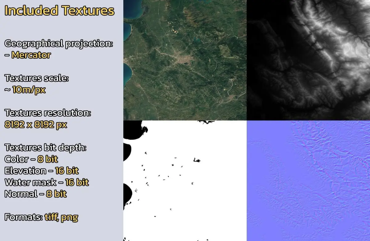 Warning: minor clouds/artifacts may be present on the diffuse color satellite texture due to the nature of the dataset. Check product images.