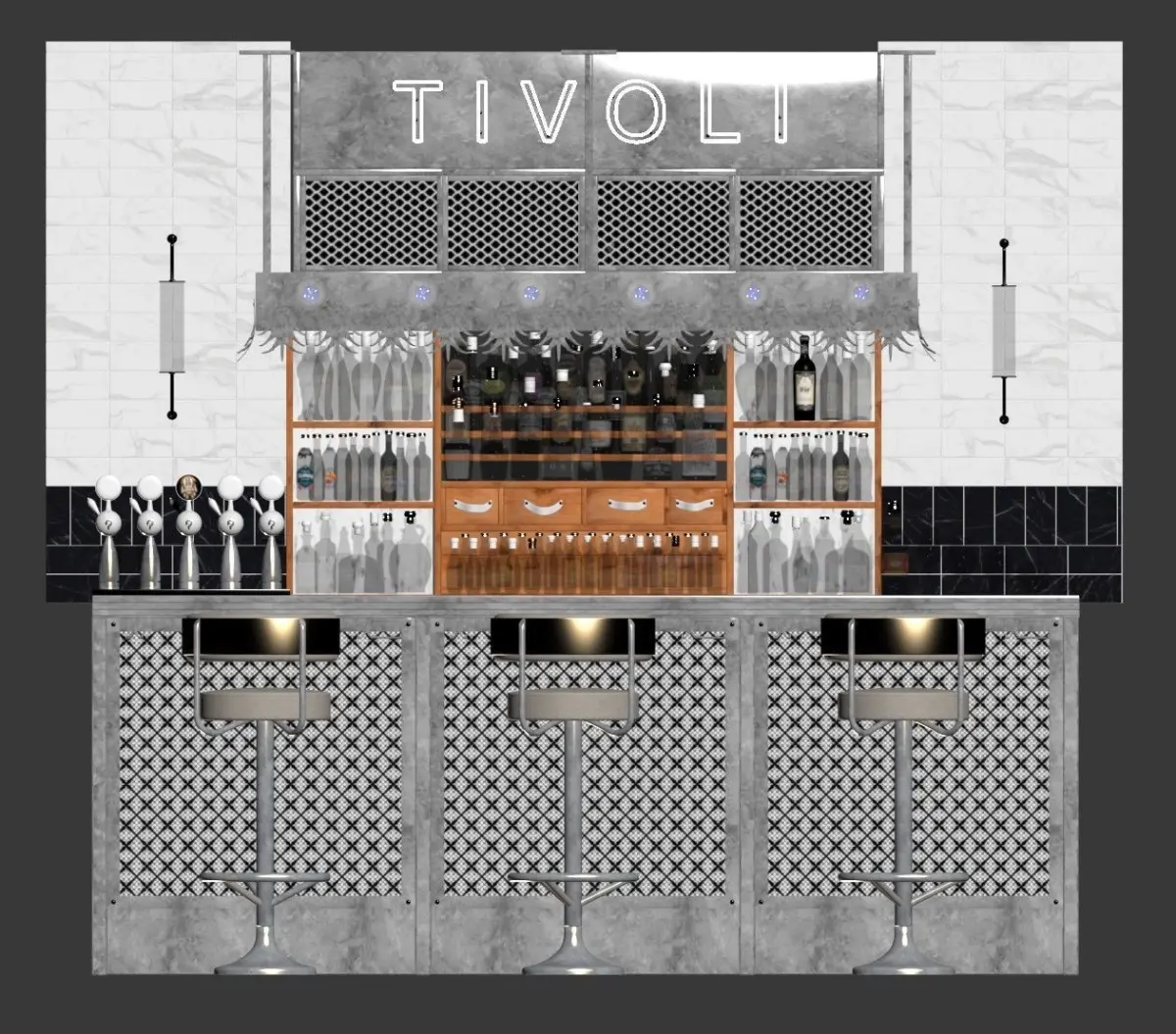 3d model - Tivoli Bars with a bar counter, chairs, lamps, bottle filling.side lamps and bar facade lighting, in the scene without light sources