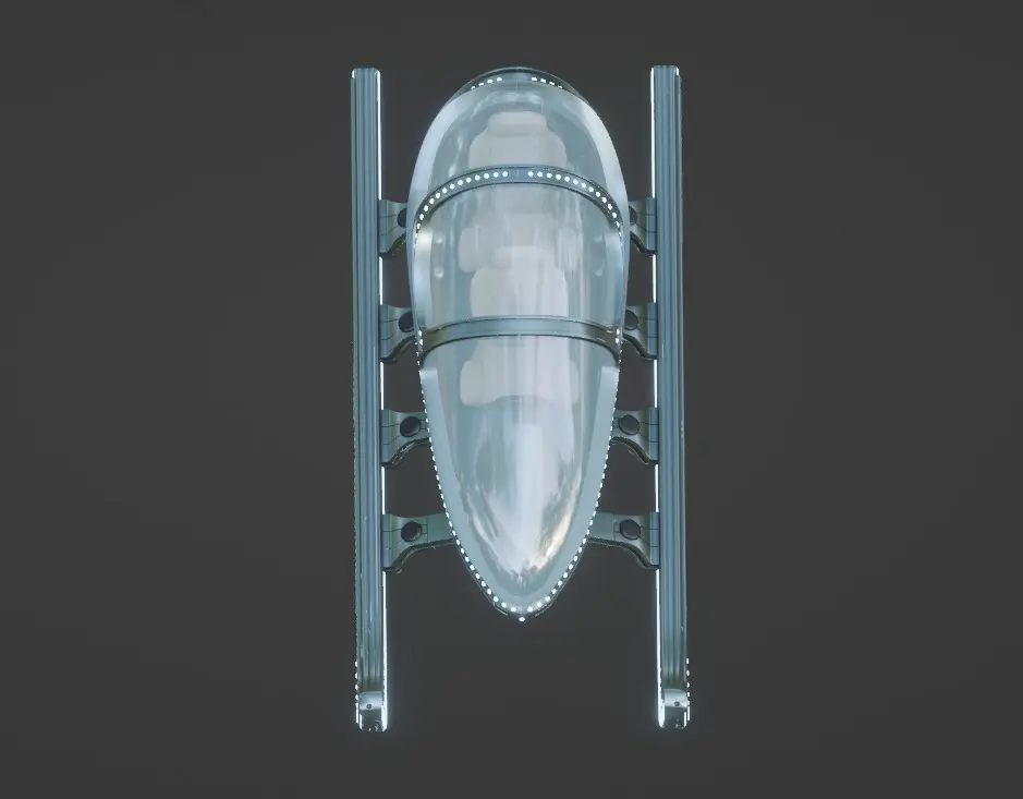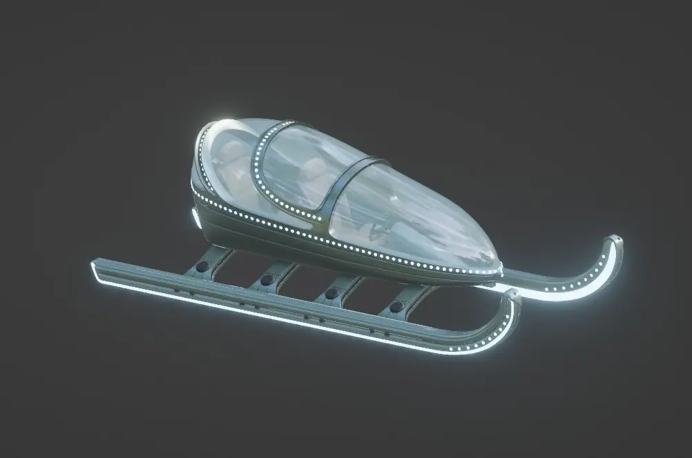 A futuristic toboggan for kids, made of transparent material with LED lights embedded along the edges, creating a magical glow as it speeds down snow-covered hills in the current timeline.