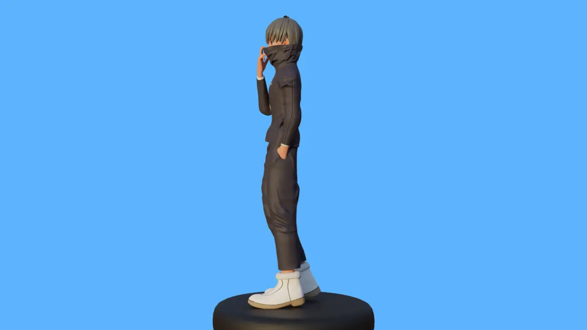 Outfit: Wearing his typical sorcerer outfit, high collar, and dark pants. The uniform folds and wrinkles are slightly accentuated to give depth and realism to the clothing.Base: A round, flat base with some light surface texture, such as rocks or ground debris, to add stability for printing.