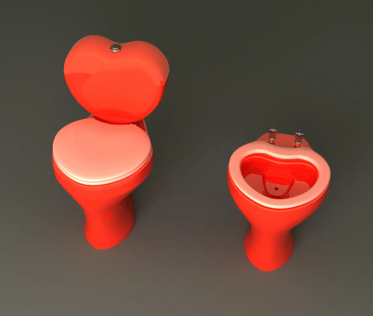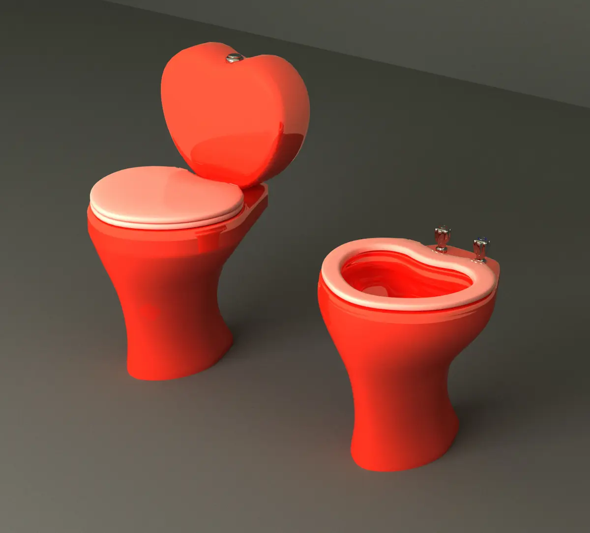 Toilet and bidet for a floor-standing bathroom, stylized in the shape of a heart. Romantic set.
