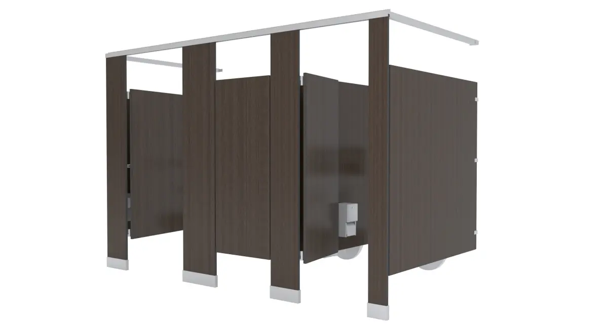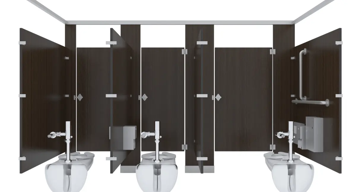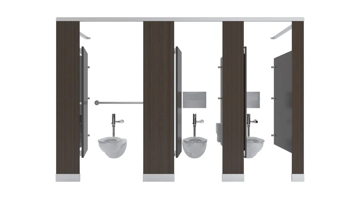 Set of partition stalls, 3 stalls, 1st is ADA 56W'x60'D, second two are 36'Wx60'D.-ADA stall includes Toilet, Grab Bars: 36, 42, & 18" Vertical Bar, Toilet Paper Dispenser, Sanitary Napkin Dispenser, Toilet Seat Cover, Non ADA include Toilet, Toilet Paper Dispenser, & Toilet Seat Cover Dispenser-1' Thick panel dividers, all objects modeled to scale. -First stall has all brackets and panel for end piece-Last stall has all brackets and panel for end piece-Can add many more in between the middle stalls-All brackets, locks, hinges, included-Wood Finish panels with stainless steel hardware, maps included-Modeled in 3ds max, rendered using Vray-All objects grouped into 1 group. Doors grouped into door so you can rotate the door open.-Rotate door open by opening main group, then rotating door open to desired location, if Pivot is not set to hinge move it to hinge by going to 'Hierarchy' ---> Click on 'Affect Pivot Point' then moving pivot point to center of hinge.-All objects at 0,0,0 for easy scene movement.