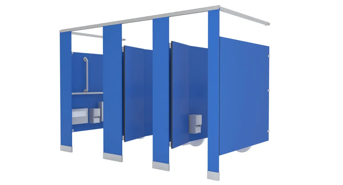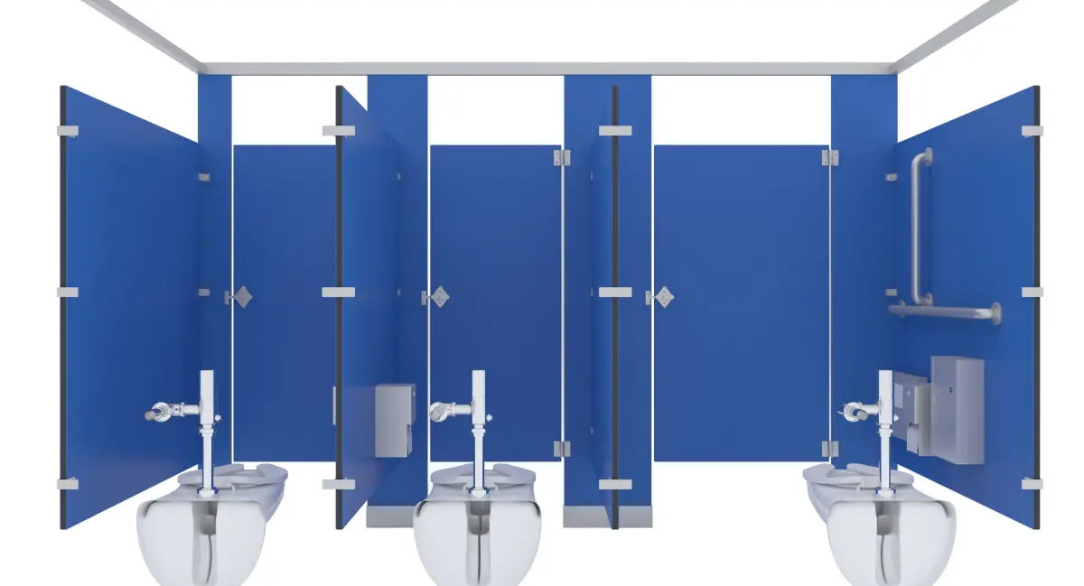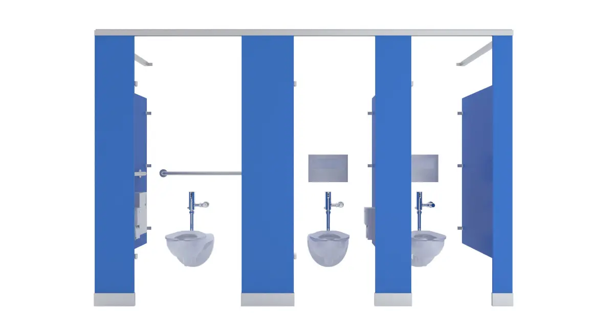 Set of partition stalls, 3 stalls, 1st is ADA 56W'x60'D, second two are 36'Wx60'D.-ADA stall includes Toilet, Grab Bars: 36, 42, & 18" Vertical Bar, Toilet Paper Dispenser, Sanitary Napkin Dispenser, Toilet Seat Cover, Non ADA include Toilet, Toilet Paper Dispenser, & Toilet Seat Cover Dispenser-1' Thick panel dividers, all objects modeled to scale. -First stall has all brackets and panel for end piece-Last stall has all brackets and panel for end piece-Can add many more in between the middle stalls-All brackets, locks, hinges, included-Blue Colored panels with stainless steel hardware, maps included. Color of partitions can be changed to any color-Modeled in 3ds max, rendered using Vray-All objects grouped into 1 group. Doors grouped into door so you can rotate the door open.-Rotate door open by opening main group, then rotating door open to desired location, if Pivot is not set to hinge move it to hinge by going to 'Hierarchy' ---> Click on 'Affect Pivot Point' then moving pivot point to center of hinge.-All objects at 0,0,0 for easy scene movement.