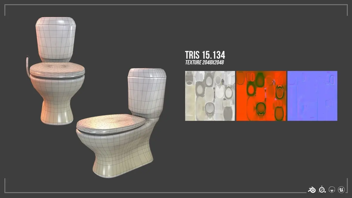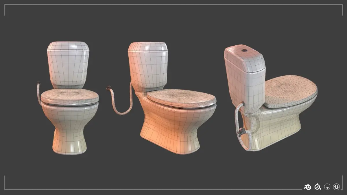 This model of Toilet was modeled with high quality and with PBR textures. All textures follow the workflow topology for games. It is optimized for use in real time. All textures are available in 2048x2048, in PNG format of 8.• PBR (BaseColor, Rougness, Metallic, Normal, AO).• Unreal Engine 4 ((Albedo) BaseColor, (ARM) OcclusionRoughnessMetallic, Normal).• Unity 5 (AlbedoTransparency, AO, MetallicSmoothness, Normal).