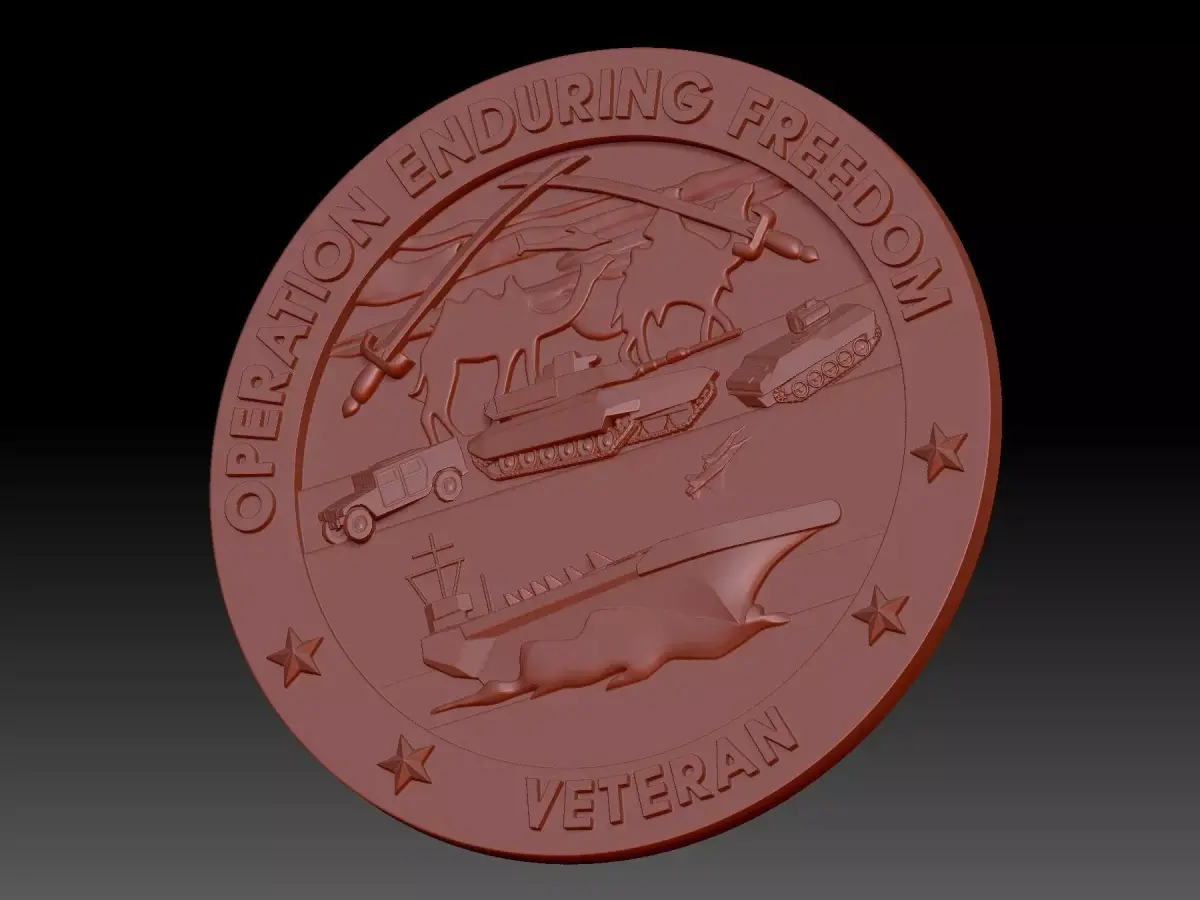 3d model of a bas-relief called Token. The image on the token shows military equipment and other elements, and the project is suitable for 3d printing and CNC machines.