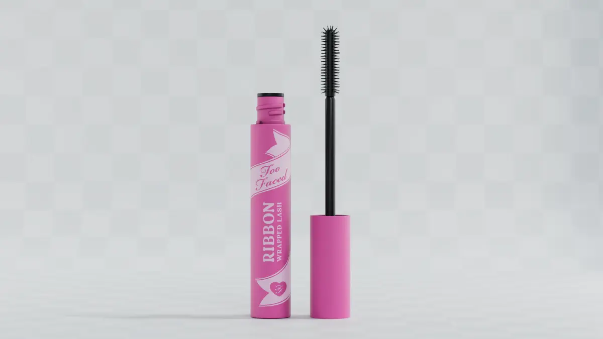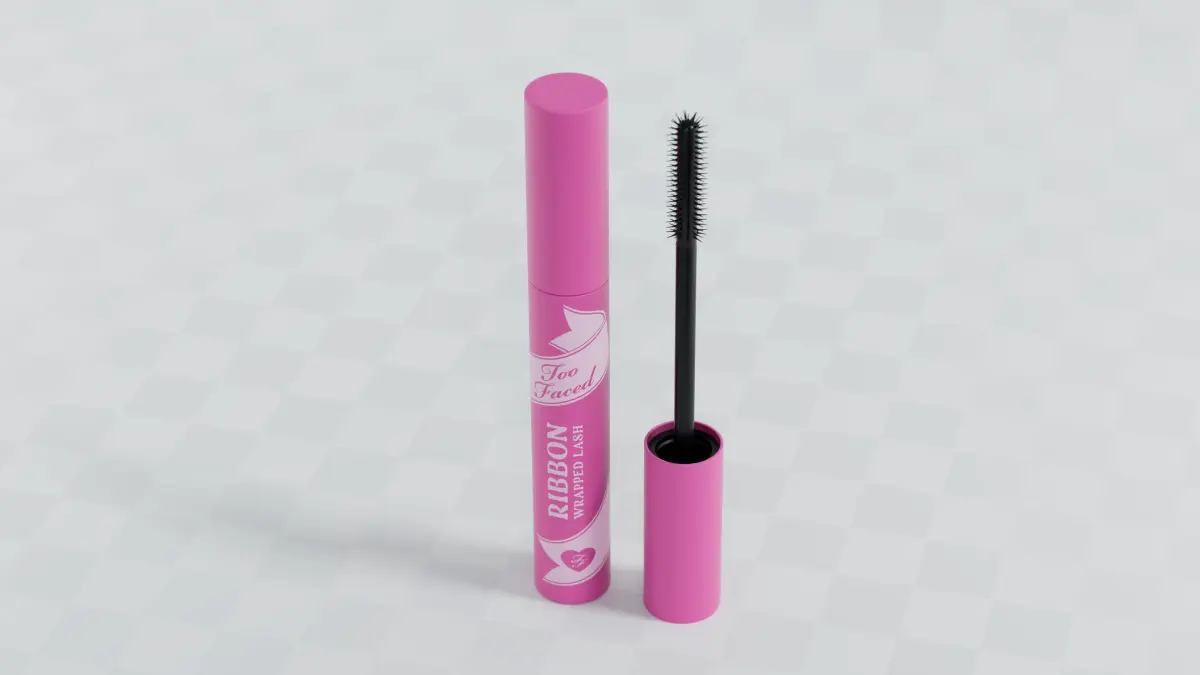 Realistic 3D model of the Ribbon Wrapped Lash mascara by Too Faced, featuring detailed textures and accurately reproduced materials. The elegant tube design and distinct bristle brush ensure a highly realistic render. The cap is modeled to open and close. Perfect for photorealistic renders and cosmetic product visualizations.