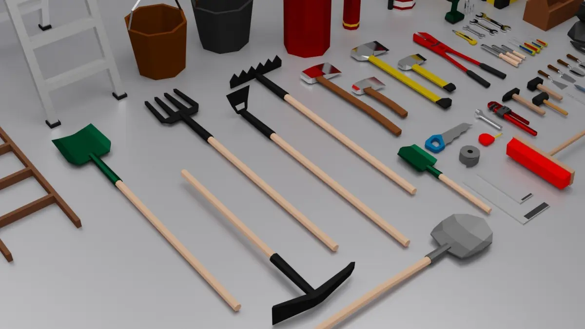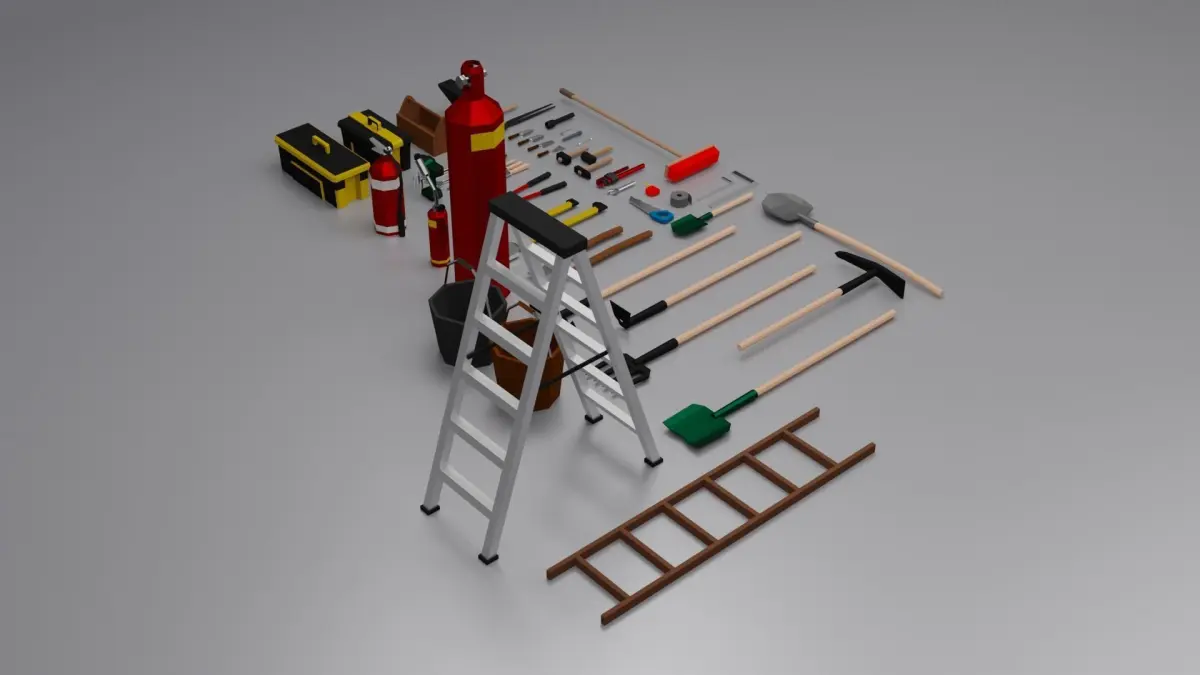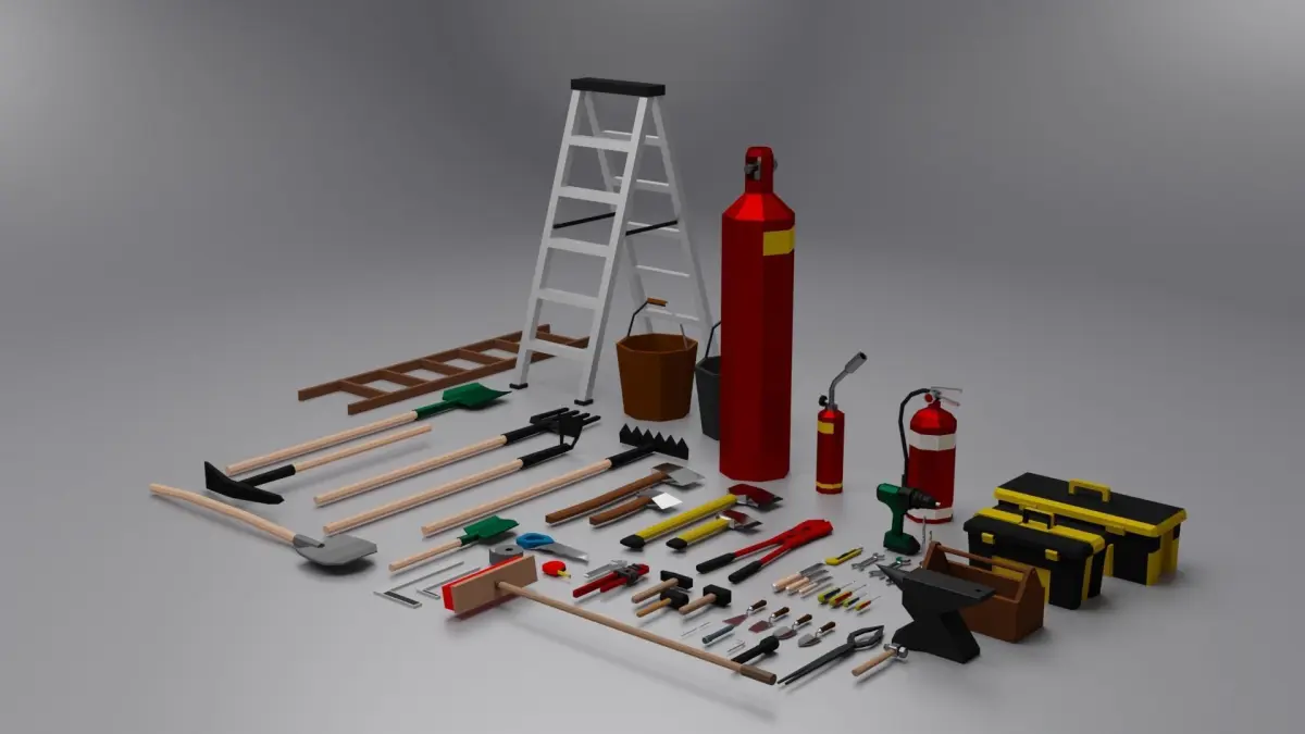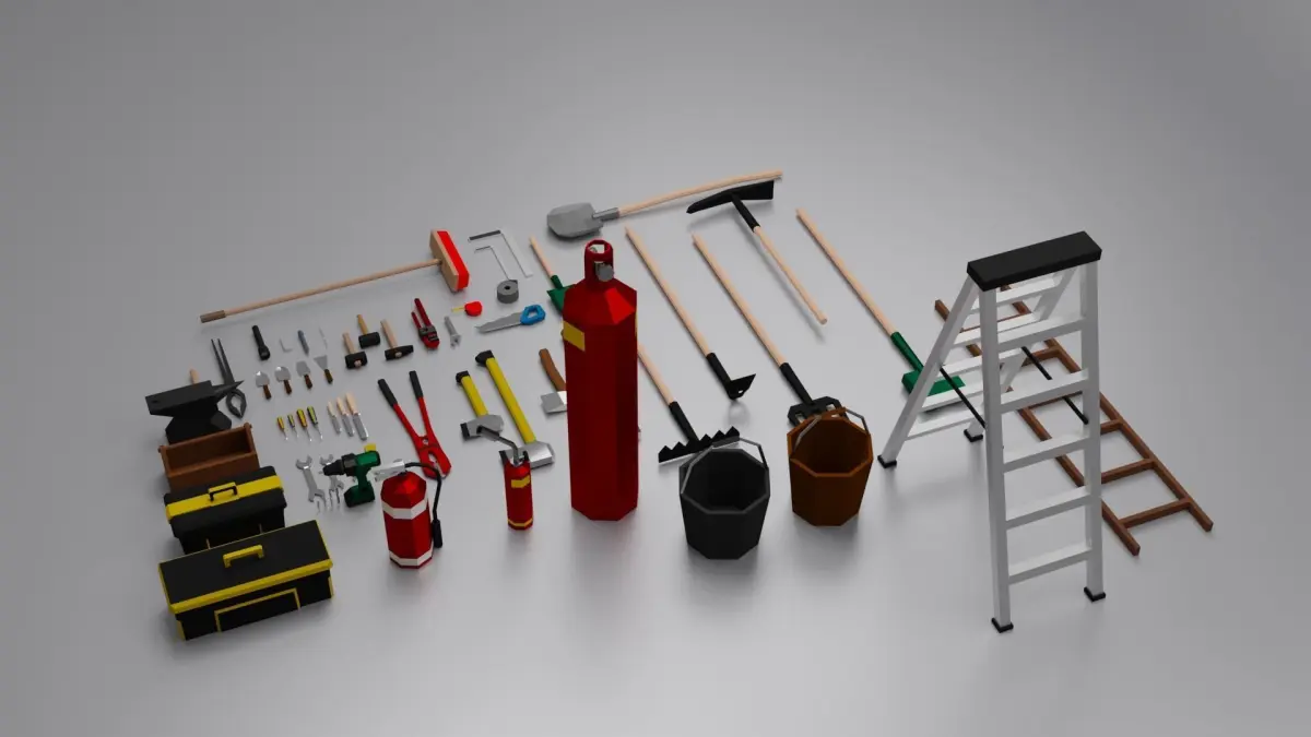 I created the objects for the unity engine and they are all game-ready. Every object is exported singly and with the FBX Files are the materials included. The material base color and the material properties can be adjusted easily in the unity engine. In total there are 61 objects, included 99 materials, on average, each object has around 200 triangles. But it must also be noted that a extinguisher already has significantly more triangles than an allen key. I would like to expand the package in the future. If you need special low-poly tools, feel free to ask.