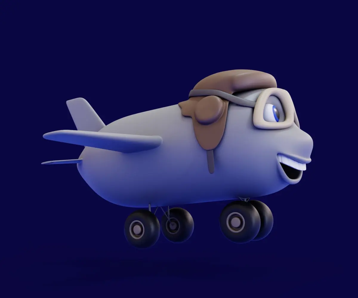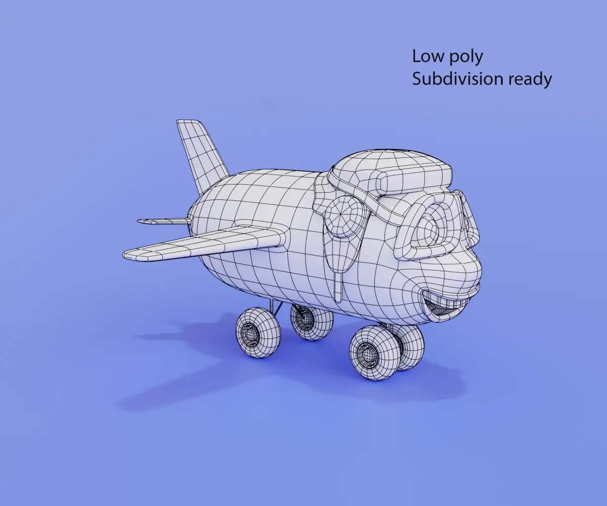 Hello! This is a cartoon airplane model with eyes.All unnecessary was removed from the scene, only one object; logical names have been assigned. The model consists of one object. Materials are set up in the blend file.