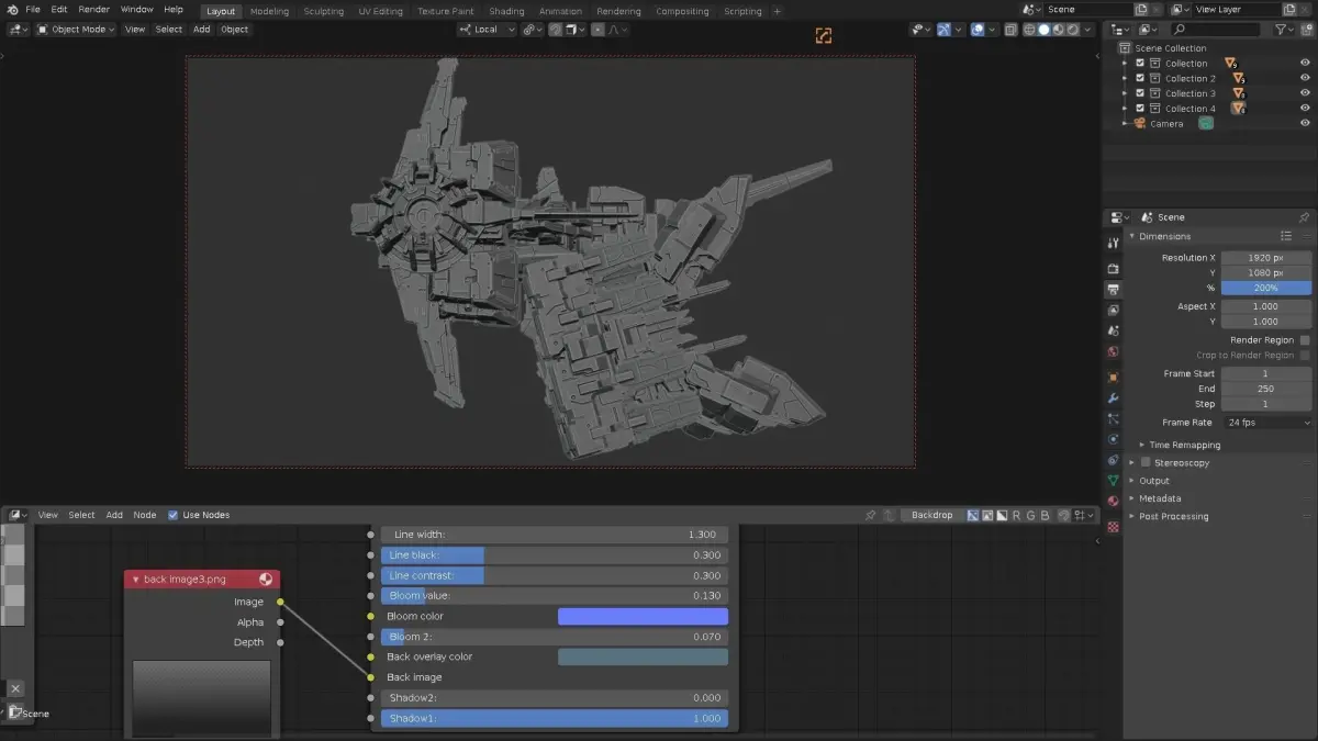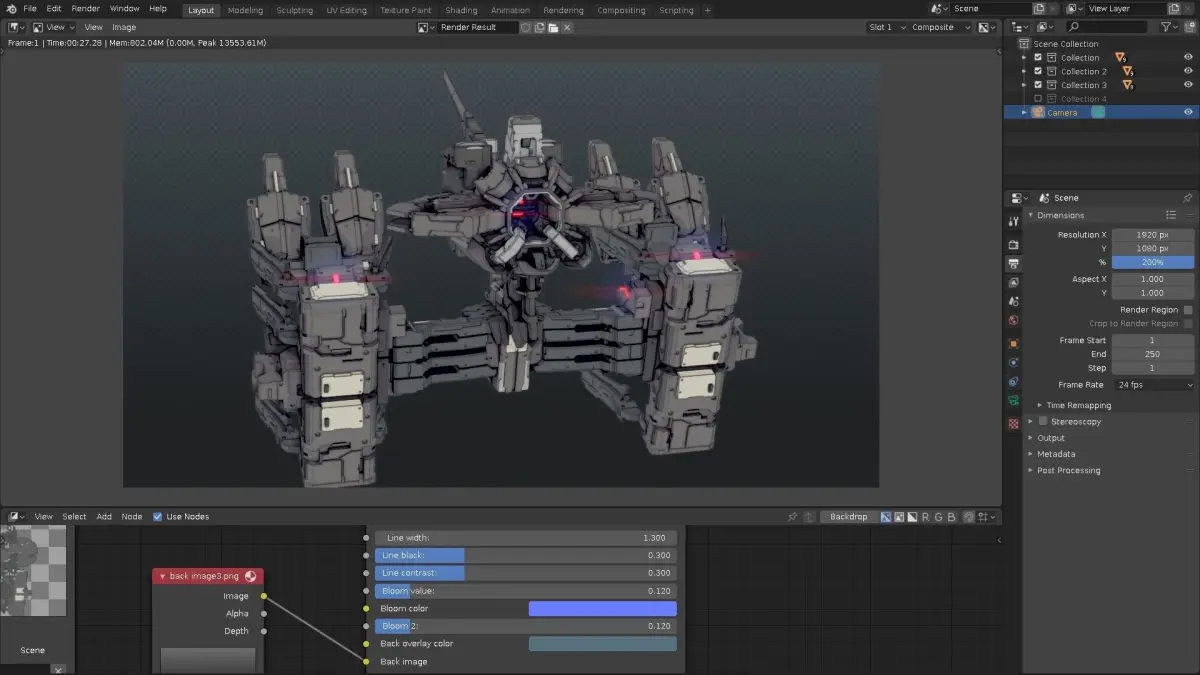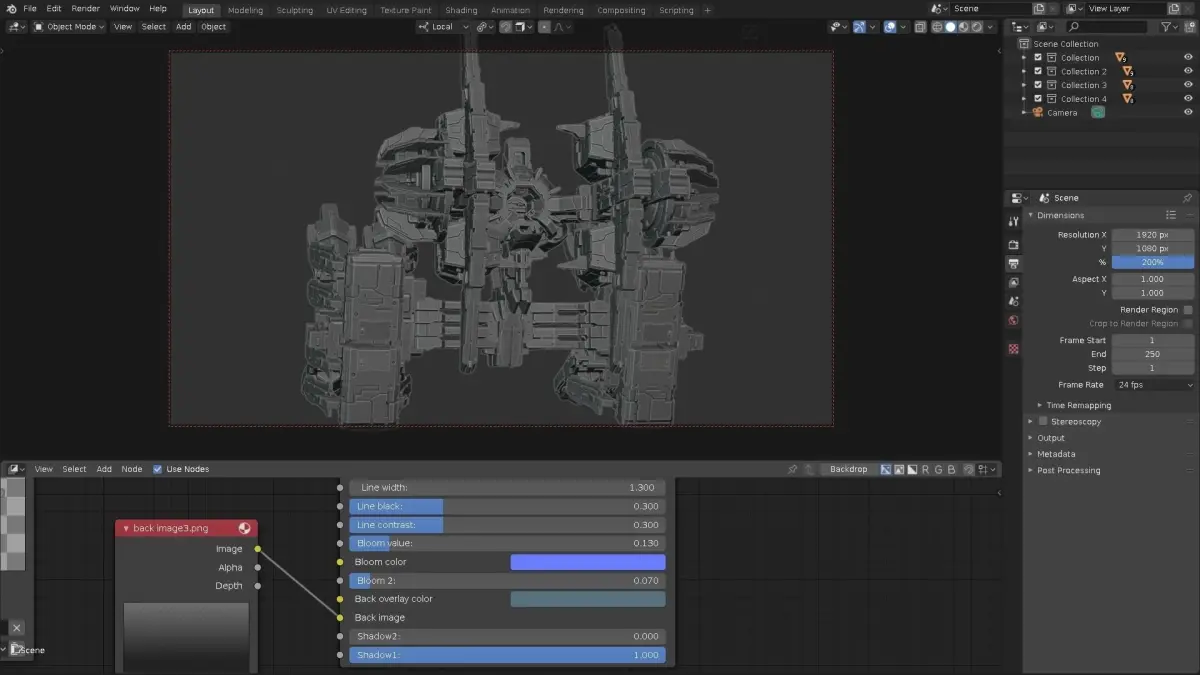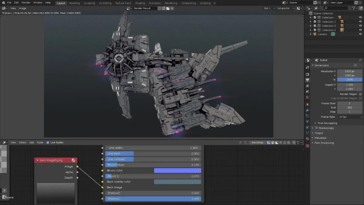 This is a blender 2.8 scene file include scifi model and composite toon node setting.