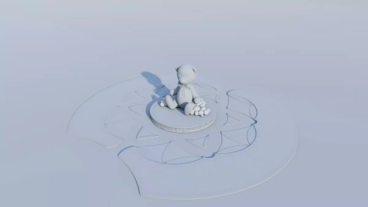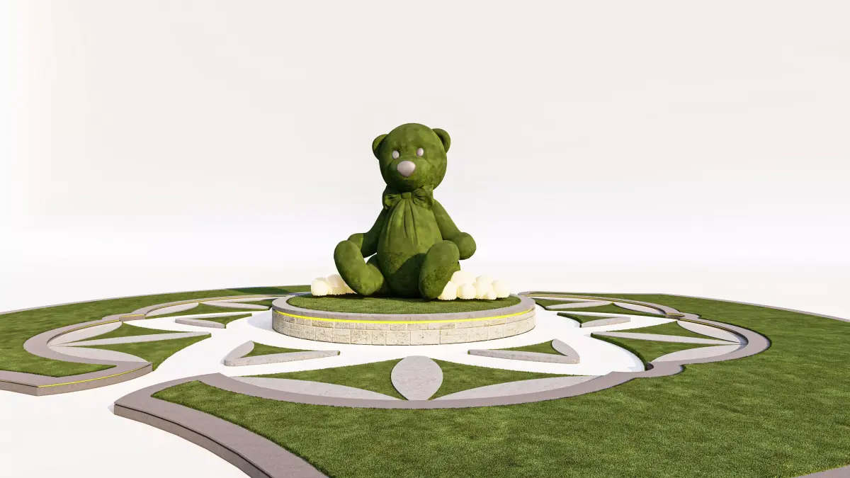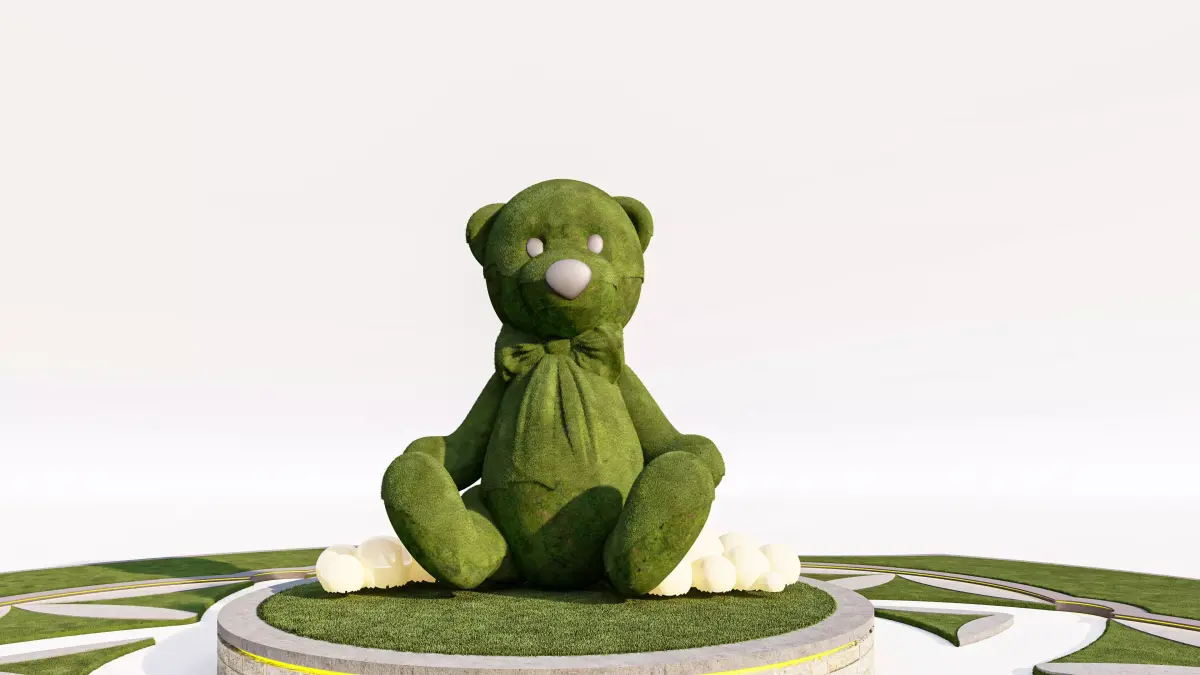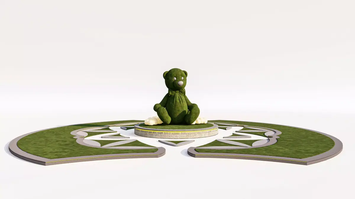 This unique 3D model features a charming and detailed Topiary Teddy Bear Sculpture set within an elaborate, geometric landscape design. It is an ideal asset for architectural visualization (Arch-Viz) of playgrounds, parks, children's areas, or whimsical garden features.