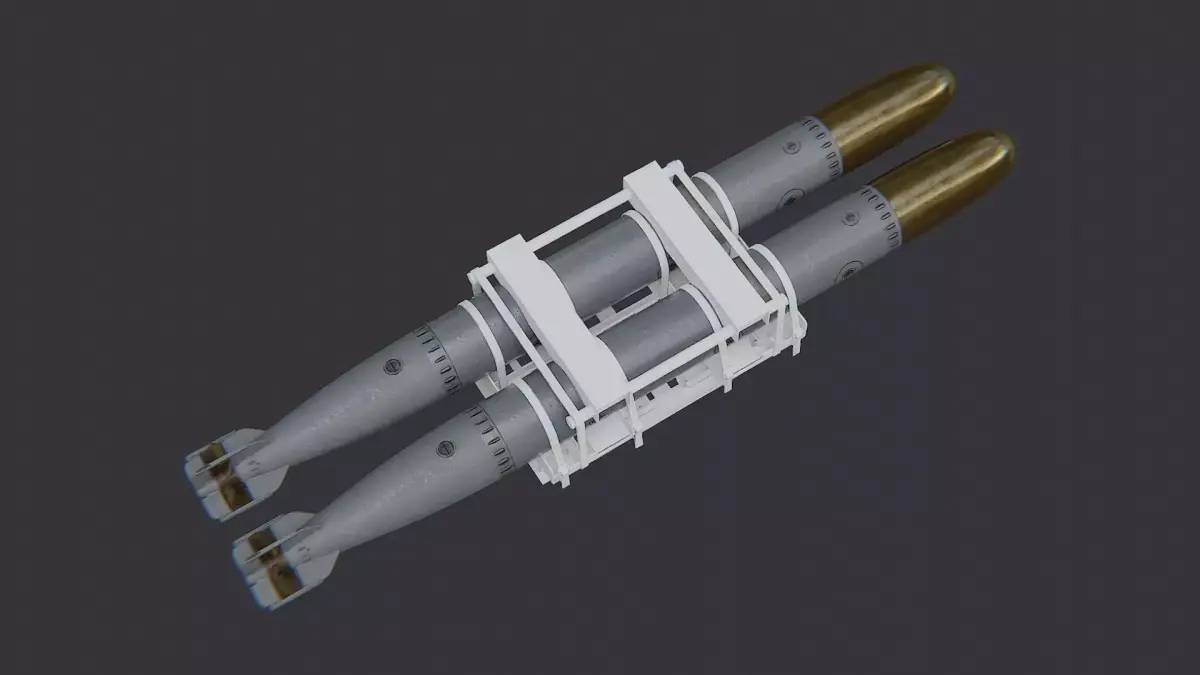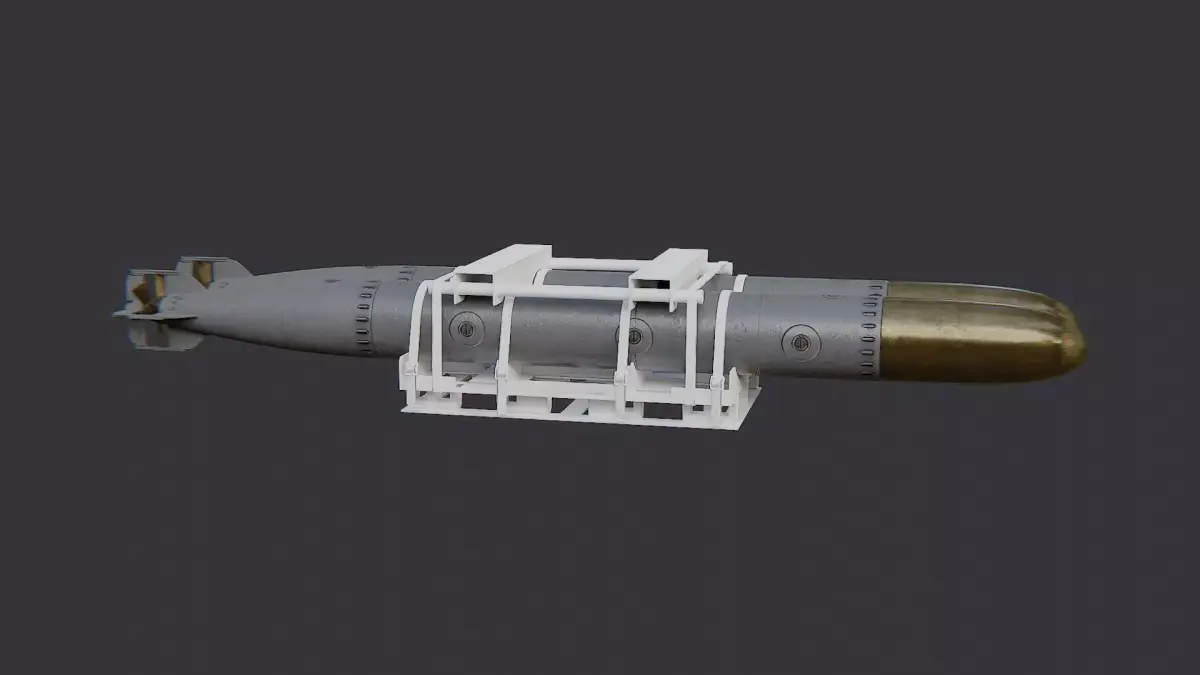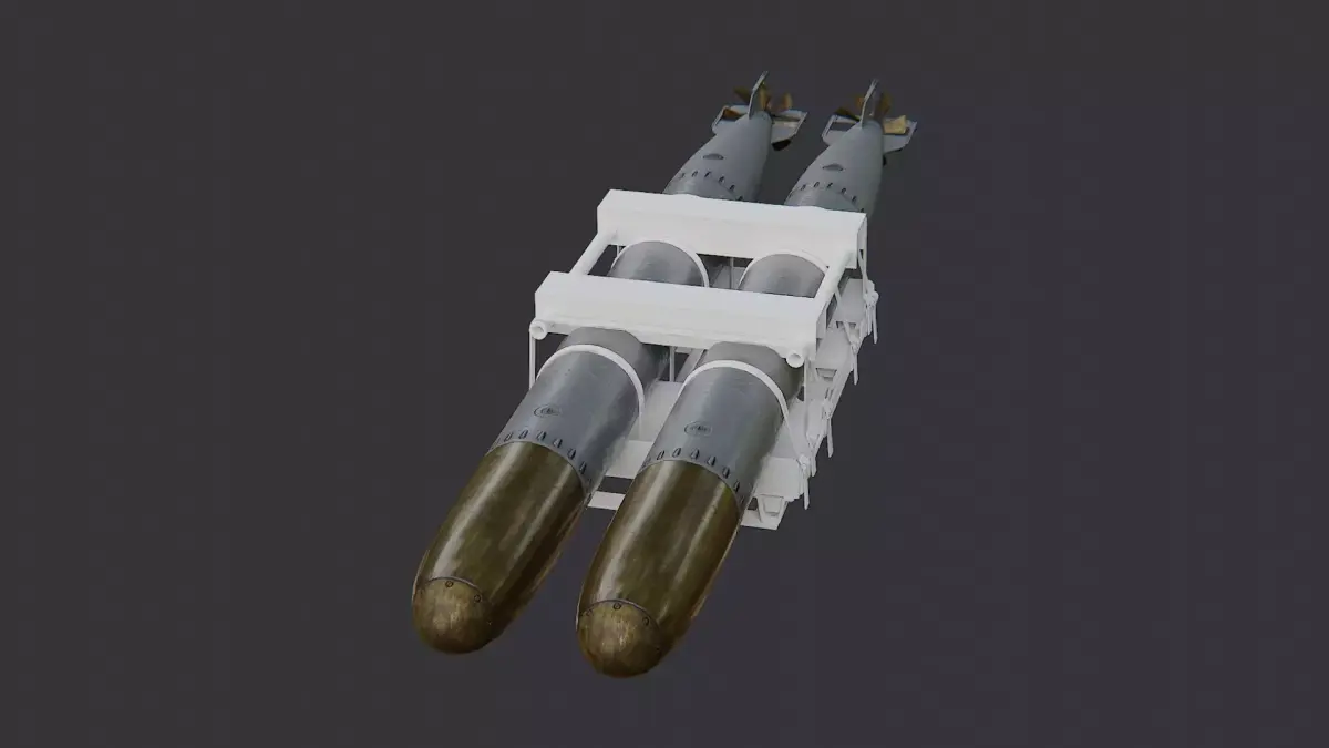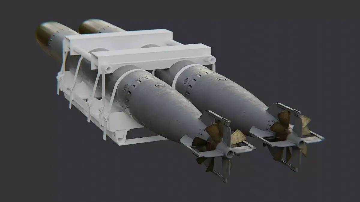 This torpedo rack shows a compact naval weapons display with a purple frame and two long torpedoes. The frame is metal with subtle wear, while the torpedoes are finished in a grey metallic tone for realism. The model includes clean UVs and multiple materials for easy customization in renders. Ideal for dioramas, museum displays, and educational naval scenes.