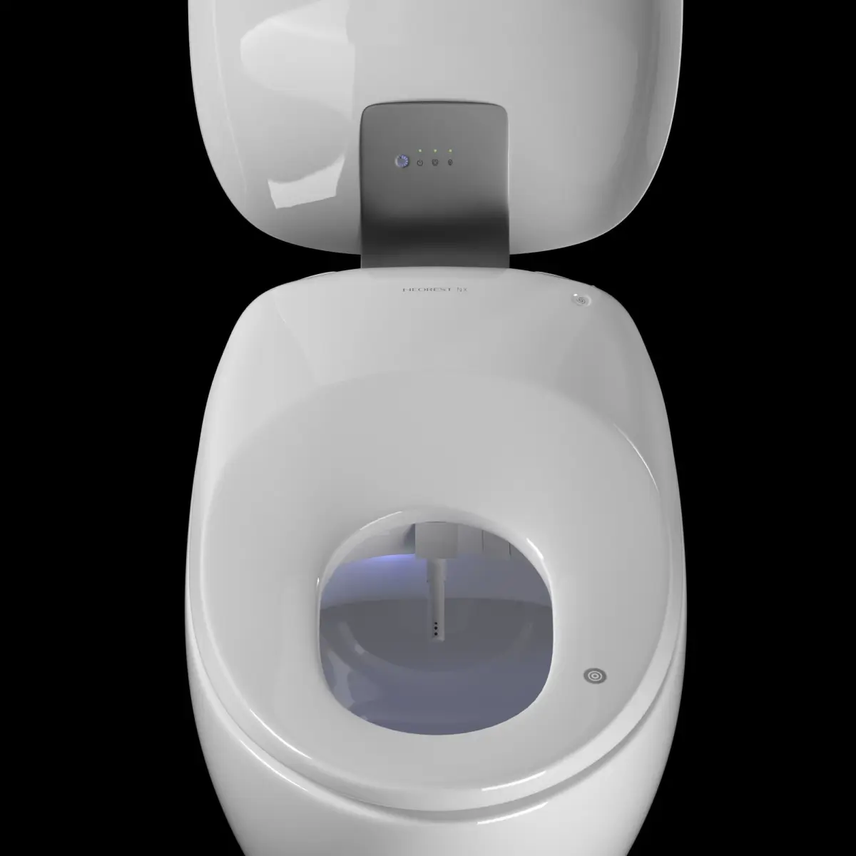 The scene contains the TOTO Neorest NX floor toilet in 3 different positions:first position - the toilet lid is closed;the UV lamp is open and on, the nozzle is extended;as well as the previous version but with a closed nozzle;remote control.
