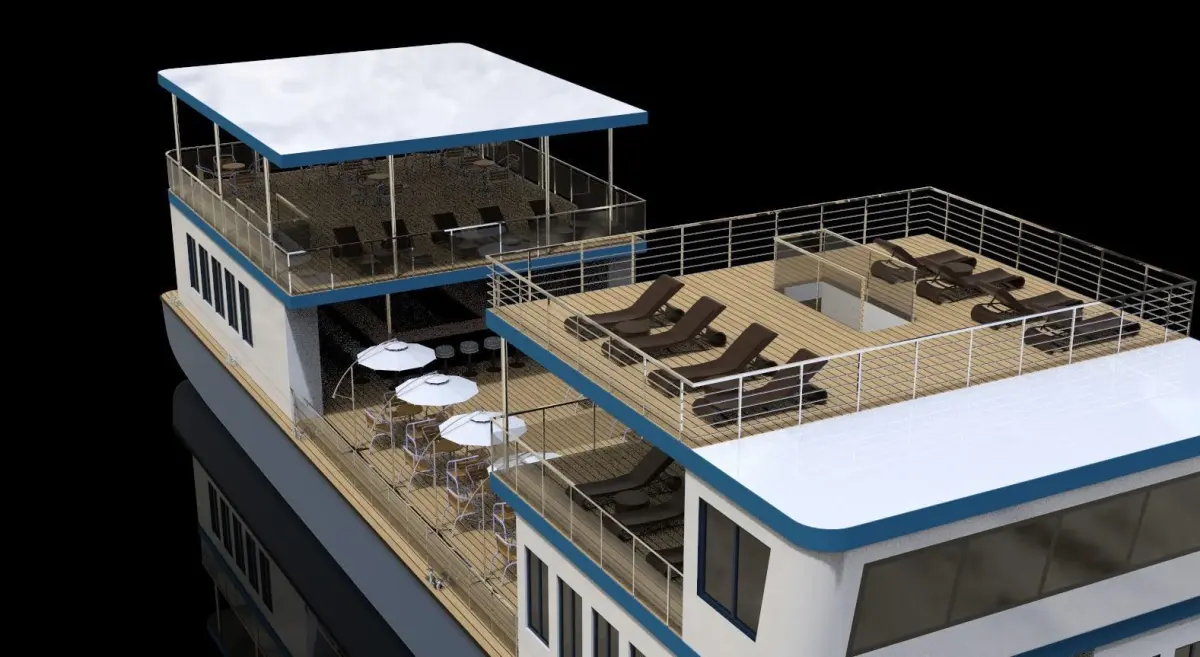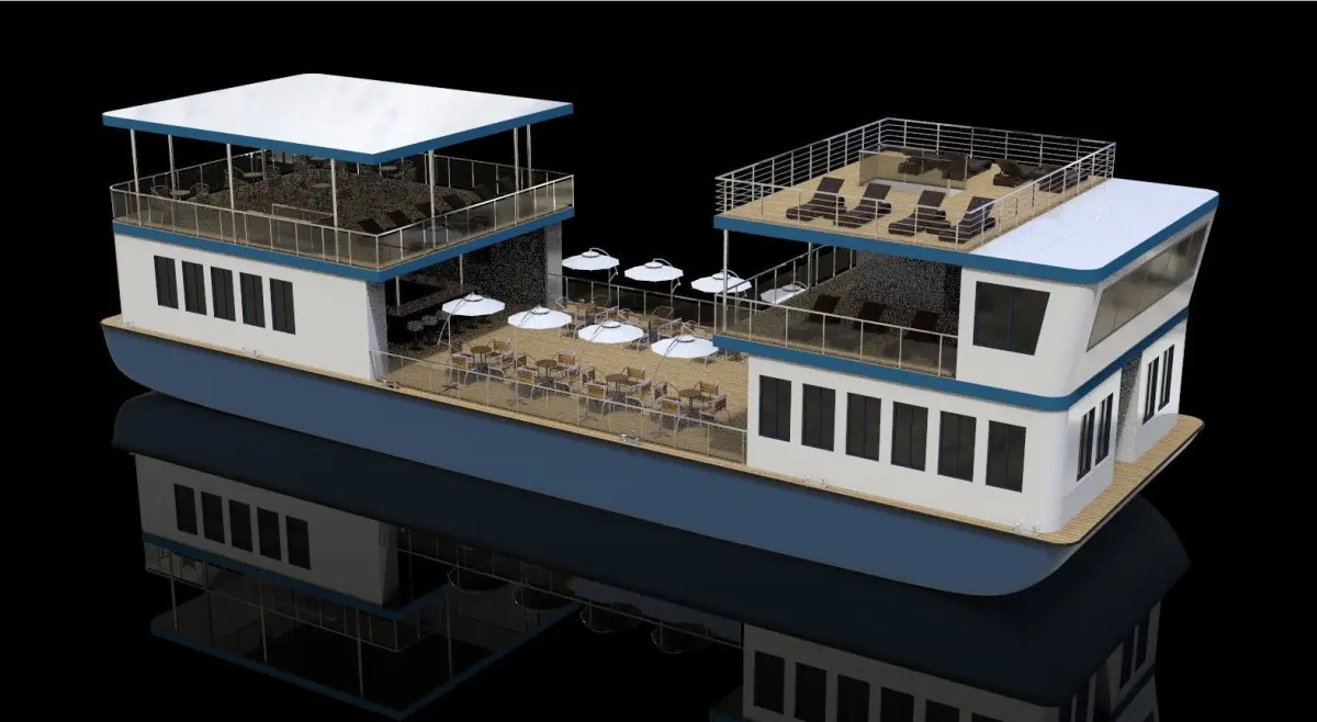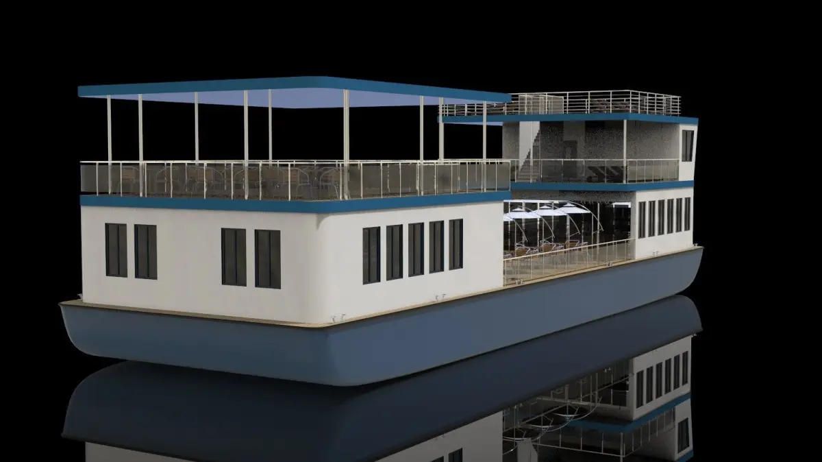 Can be used for family play, vacation with friends, can be rented, can take 20 to 30 people, can also be used for water catering, large open deck, indoor area is only necessary design, this boat is very suitable for rivers with little rain area。