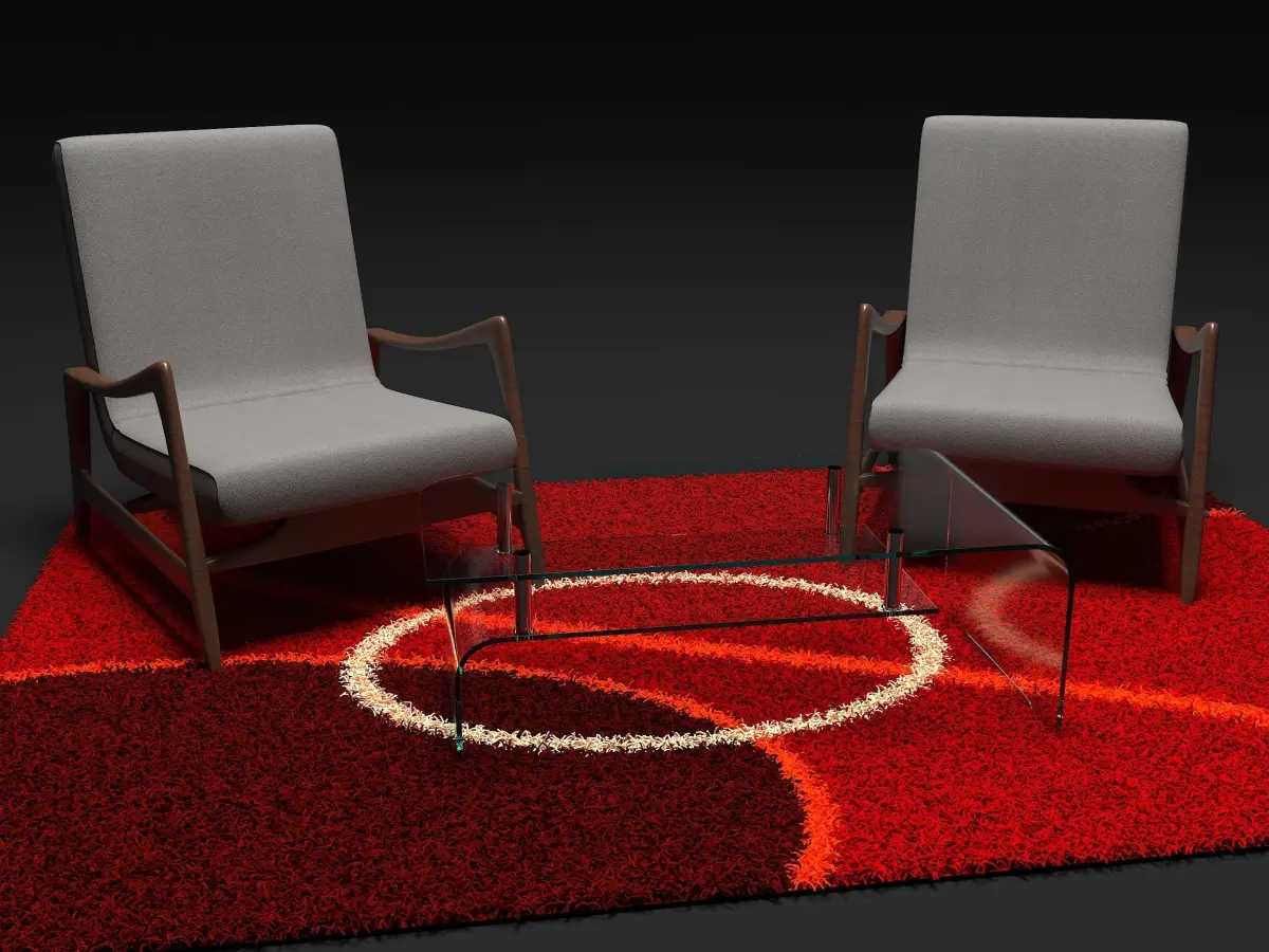a chair made under 3ds max and render with vray 5, raw renderings without any modification or retouching, two light source dome with hdri and light disk of vray .. textures made under painter substance, two chairs and a glass coffee table and a rug with vray fur.. hope you like it thank you