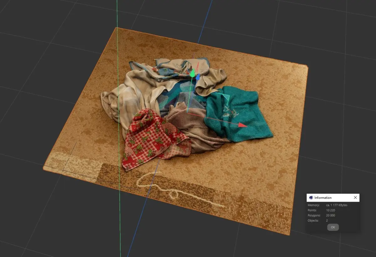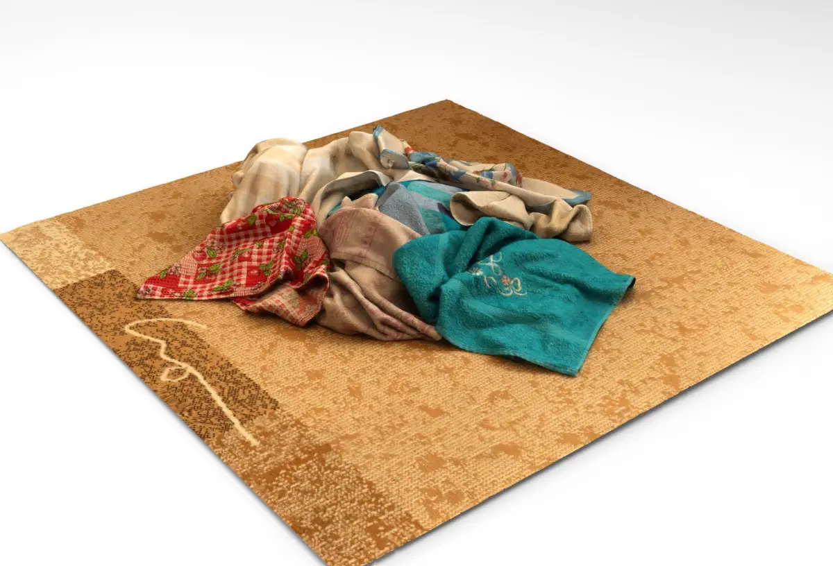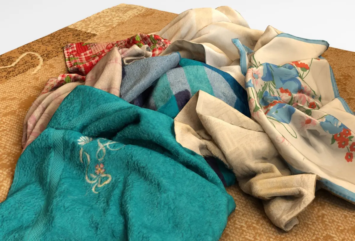 Photogrammetry of some towels spreado n the floor.Polygon count : 20000Textures zippedFormats : stl, c4d, obj, fbx, gltf