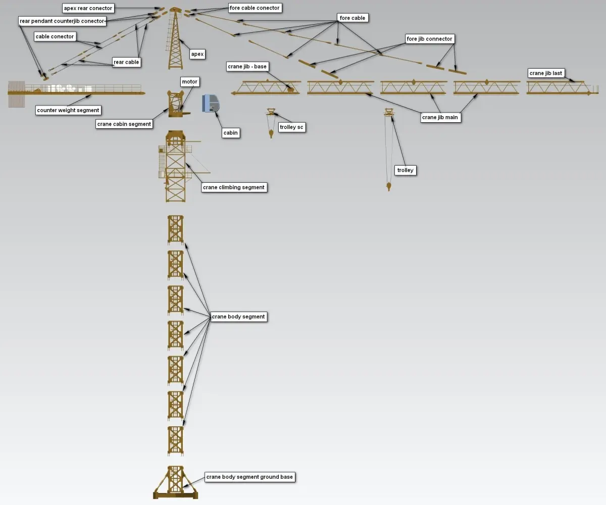 So far assembly of this model consist of 20 parts (more will come as model get more details):1. apex2. apex rear conector (connection between 'apex' and 'rear pendant counterjib conector')3. cabin4. cable conector (connection between two 'rear cables' holding counterjib)5. counter weight segment6. crane body segment ground base (ground segment)7. crane body segment (repeating segment)8. crane climbing segment9. crane cabin segment10. crane jib - base (jib segment connected to 'crane cabin segment')11. crane jib last (end of jib segment)12. crane jib main (repeating jib segment)13. motor (motor behind cabin)14. fore cable (repeating cable that hold jib)15. fore cable conector (connection between `apex` and `fore cable`)16. fore jib connector (unfinished part, connection between 'crane jib main' and 'fore cable')17. rear cable (repeating cable that hold 'counter weight segment')18. rear pendant counterjib conector (connection between 'rear cable' and 'counter weight segment', and 'rear cable' and 'apex rear conector')19. trolley (trolley with cage and long cable)20. trolley sc (trolley without cage and with short cable)21. ASSEMBLY (part only, due to some error I was not able to make it in STEP format)