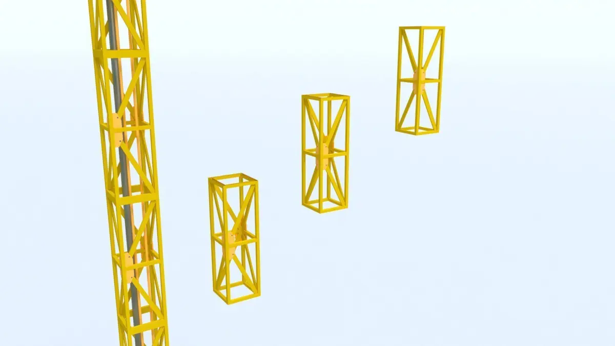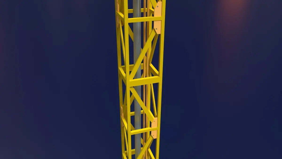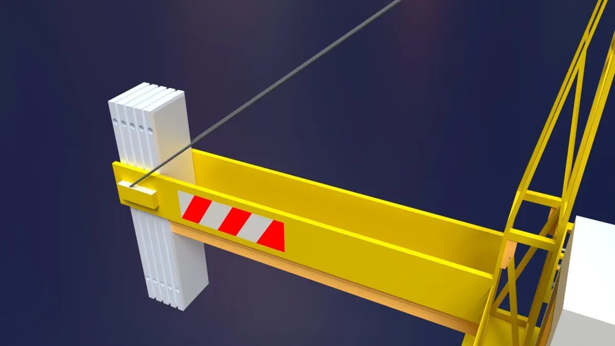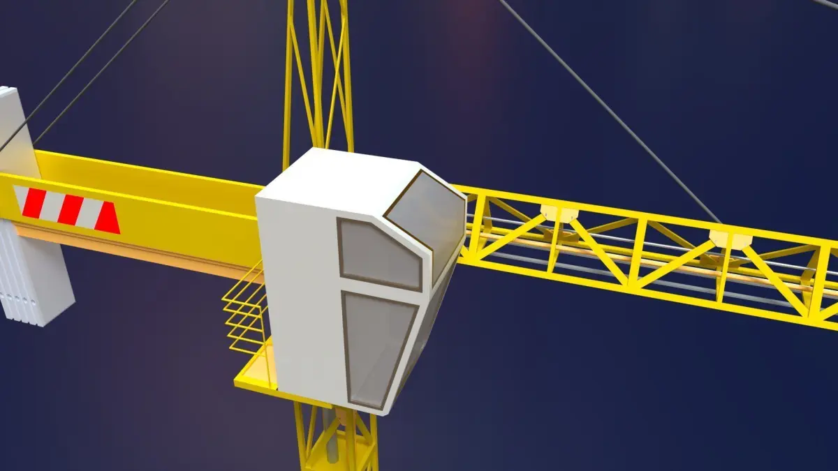 A 3D model of a tower crane - a type of machine, equipped with a hoist rope, wire ropes or chains, and sheaves, that can be used both to lift and lower materials and to move them horizontally. It is mainly used for lifting heavy objects and transporting them to other places.