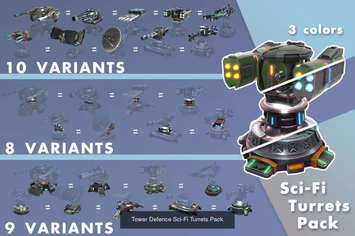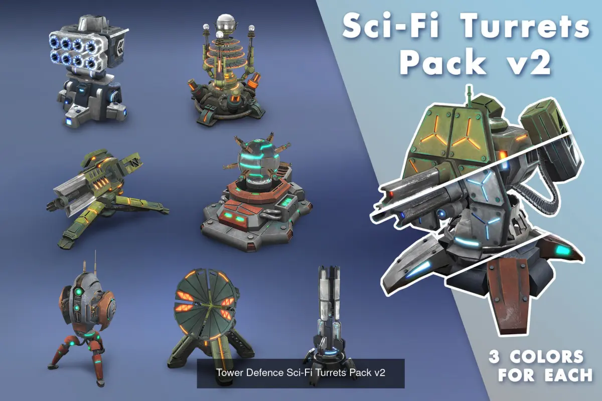 The pack contains 8 turrets, each with 3 color variants.Turret parts are separate meshes and suitable for animation, also some parts can be disabled to slightly change the design.The rocket launcher turret has the rocket as a separate mesh.Some example animations are included in the Unity package.