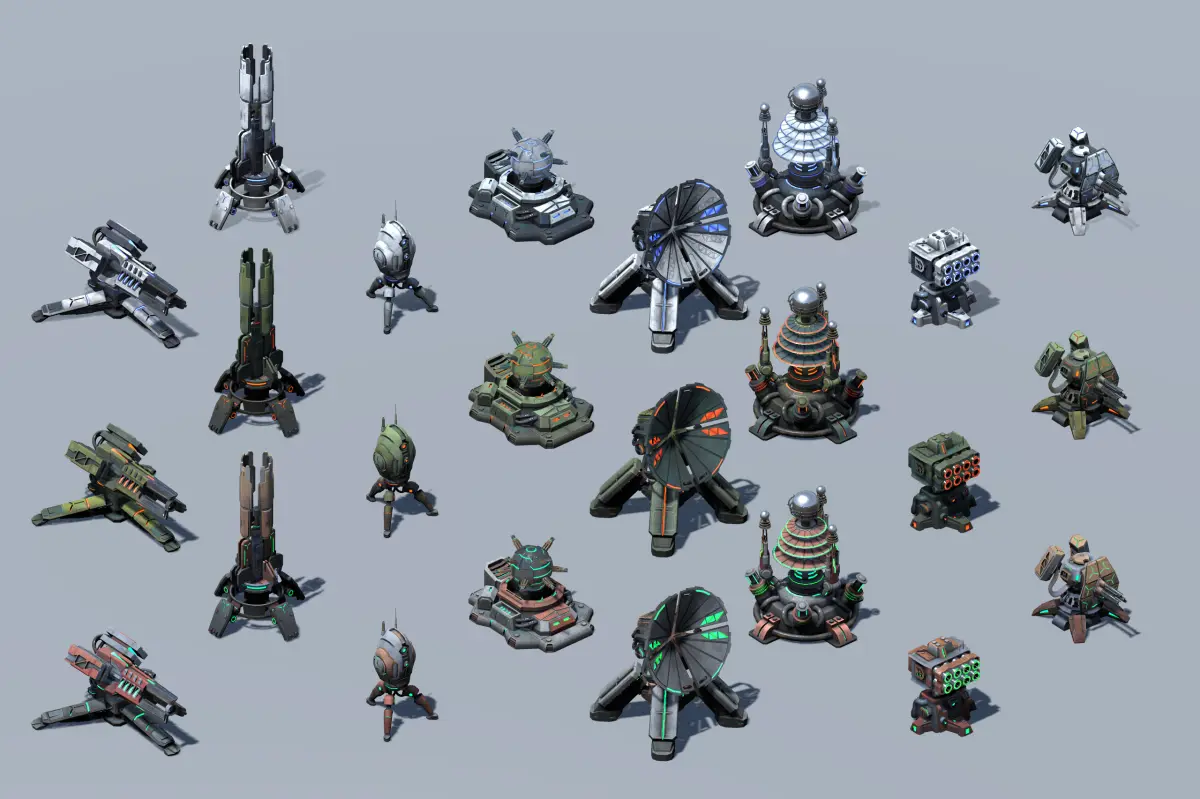 The pack contains 8 turrets, each with 3 color variants.