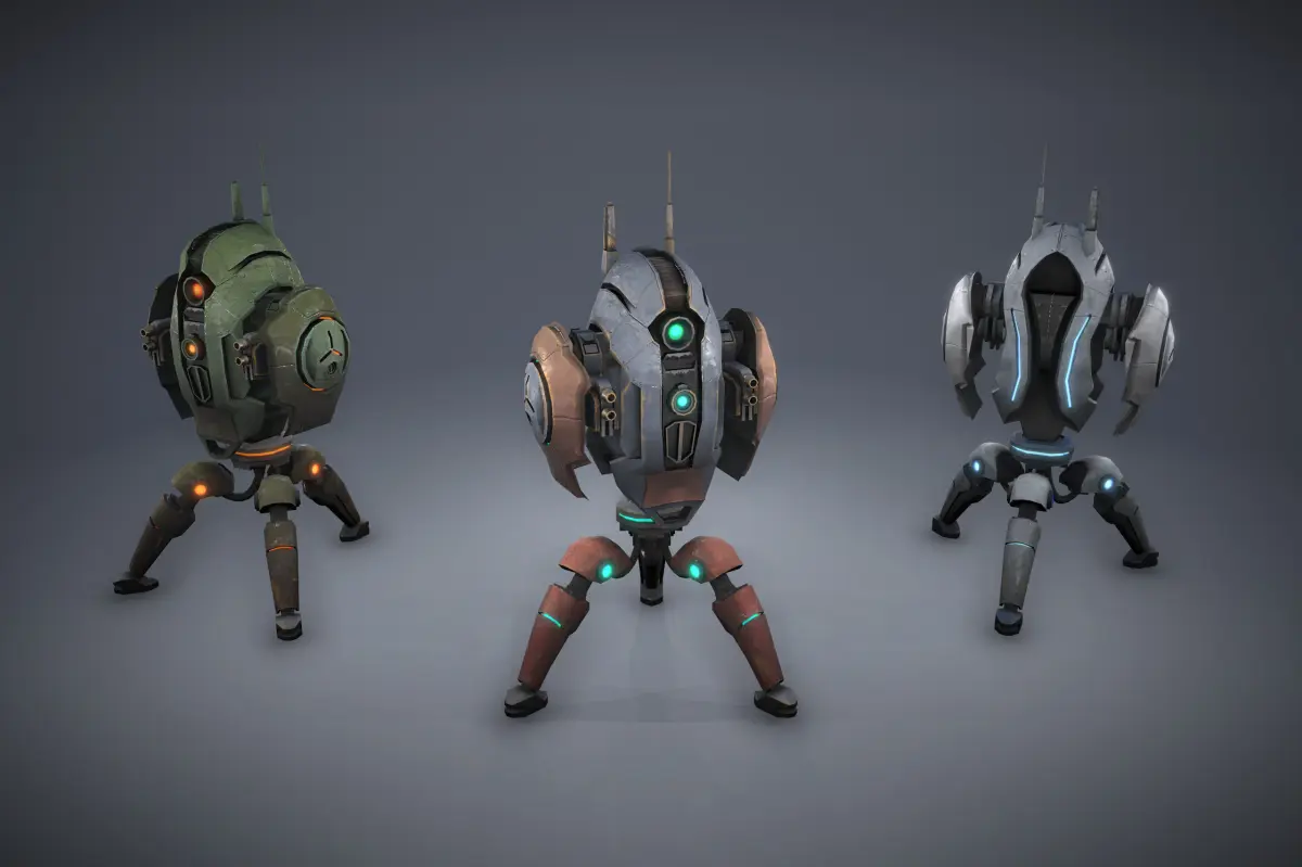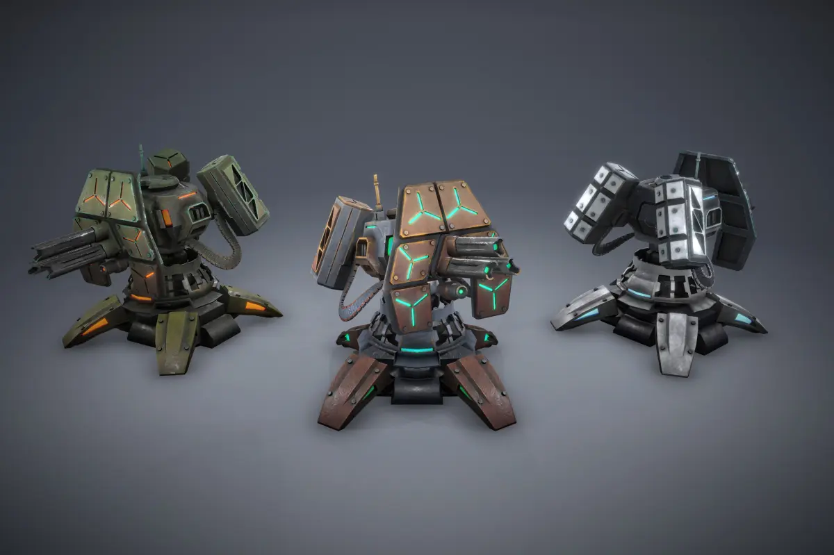 Turret parts are separate meshes and suitable for animation, also some parts can be disabled to slightly change the design.