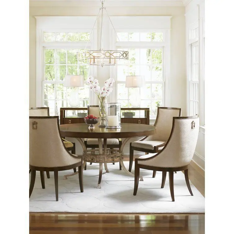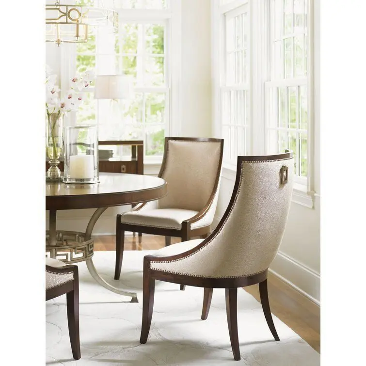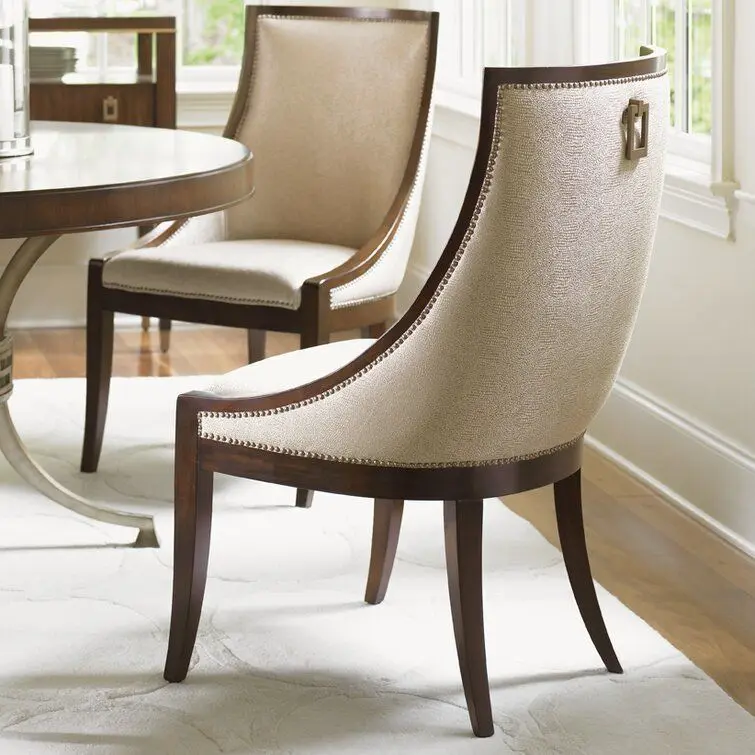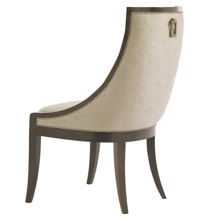 - Elegant curving design is featured in a contemporary cobblestone pattern fabric with a rose-gold soft luster. Decorative nailhead trim frames the piece while a custom-designed drop pull adorns the back.