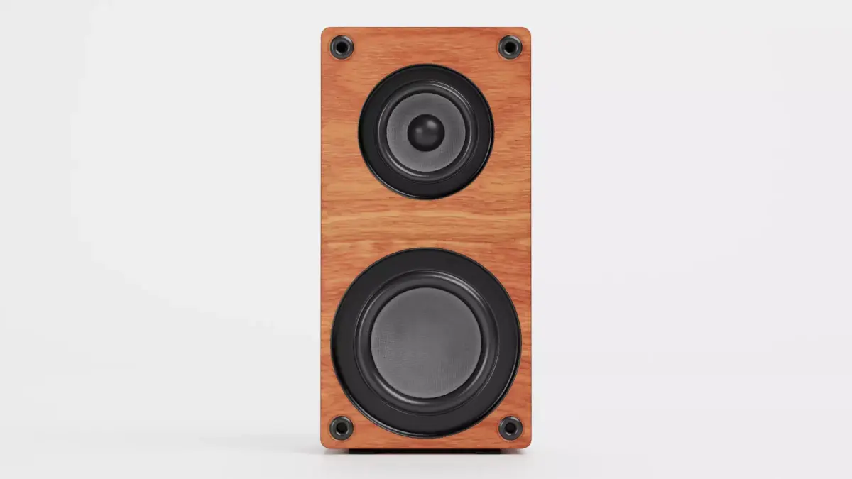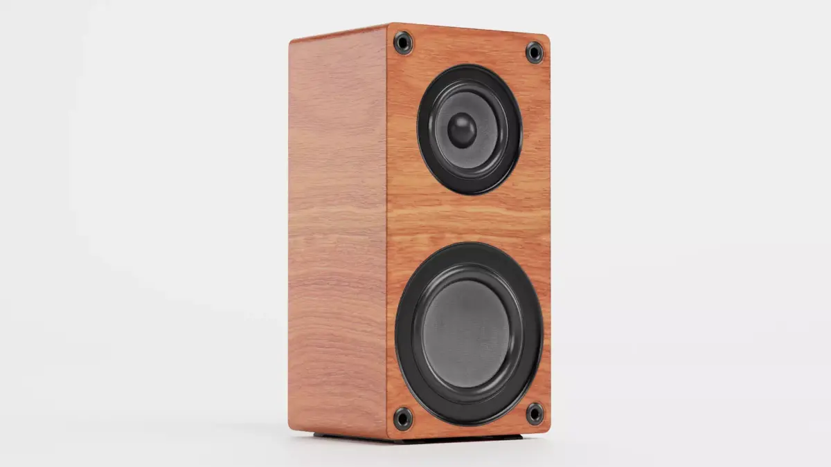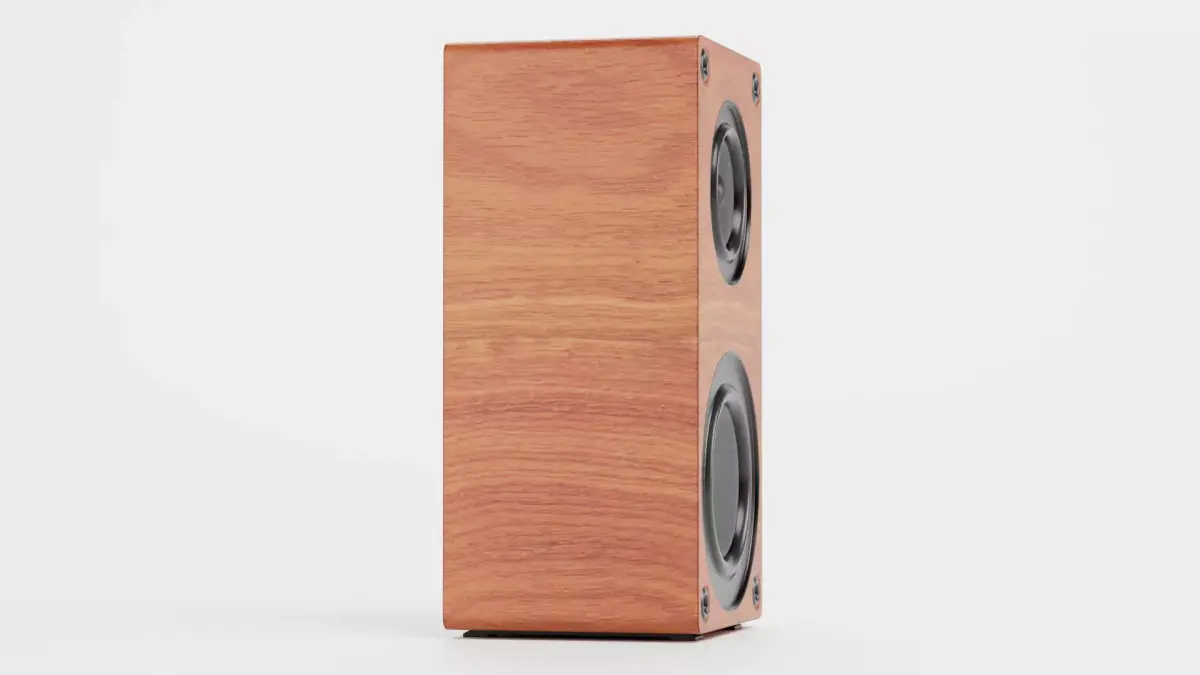- Modern tower speaker with realistic wooden surface