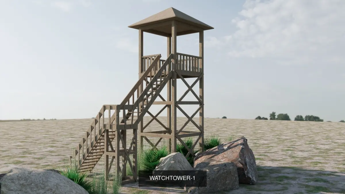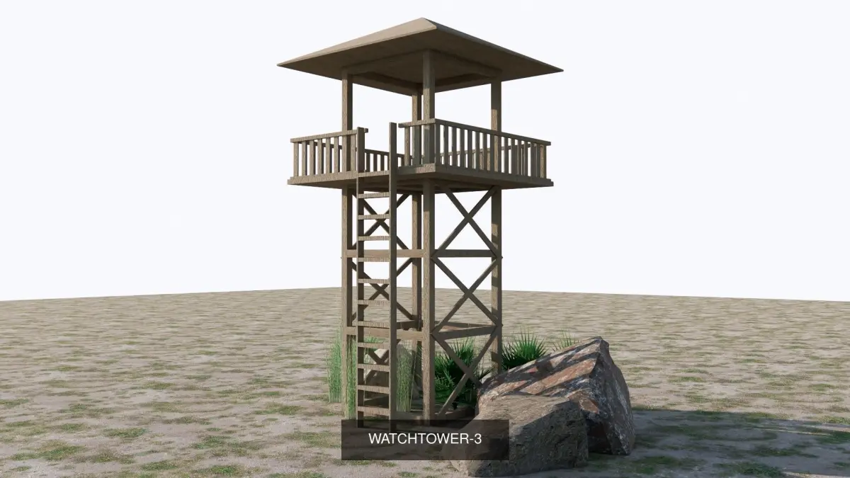 WATCHTOWER MODEL. IT WAS DESIGNED ESPECIALLY A STRUCTURE THAT CAN BE USED IN WAR GAMES AND MOVIES. IT IS OF WOOD MATERIAL AND IS 6 METERS HEIGHT. YOU CAN USE THIS MODEL IN YOUR PROJECT OR MOVIE STAGES YOU WANT. IMAGES AND VIDEO HAVE BEEN ADDED FOR EXAMPLE. REQUIRED FILE FORMATS HAVE BEEN UPLOADED. THANK YOU FOR YOUR INTEREST. PLEASE DON'T FORGET TO LIKE AND COMMENT.