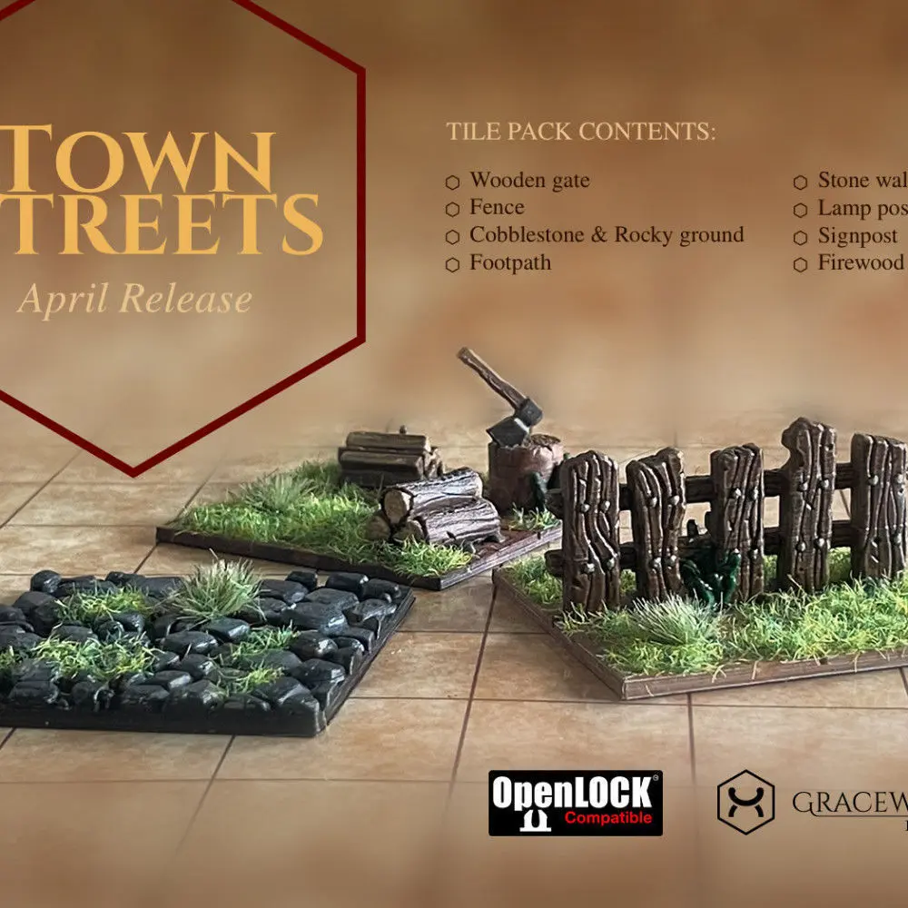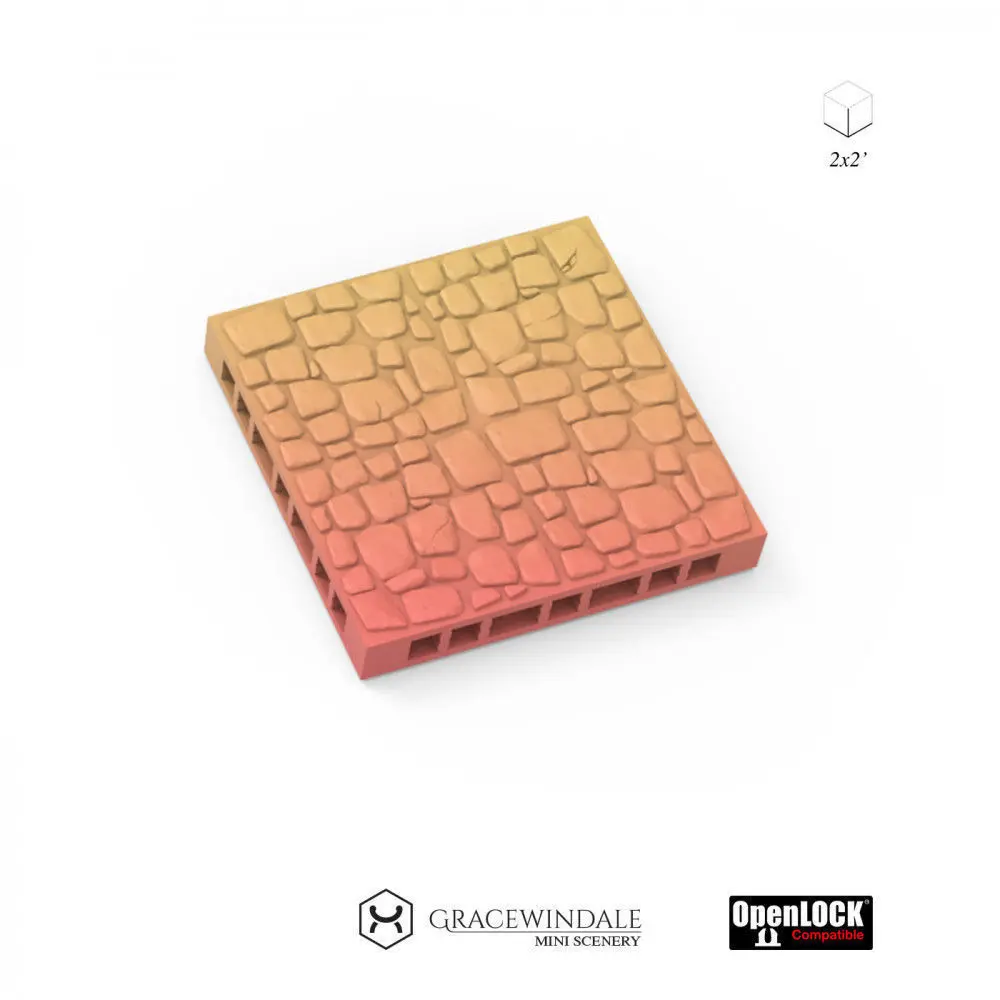 All tiles are 2x2 inches and have 2 options: thin base and OpenLock (_OL.stl) compatible base. Props without attached tile base are included as well.
