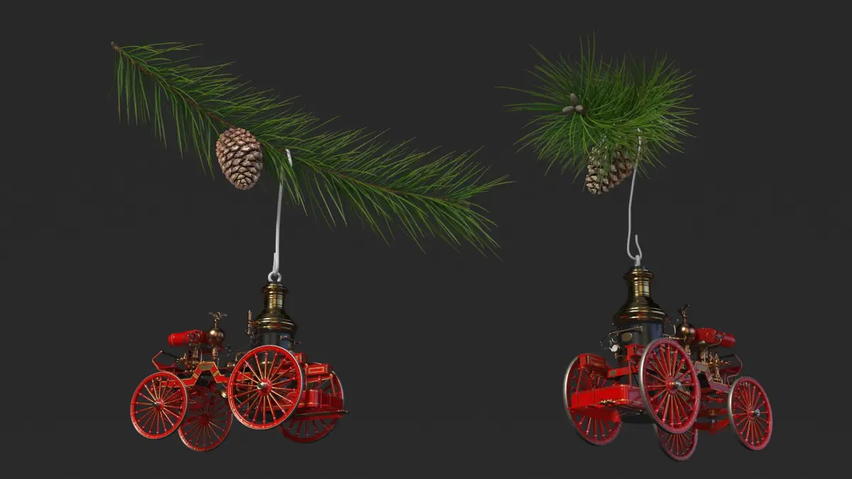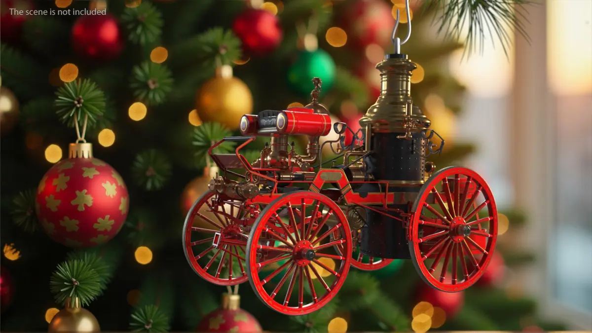 Toy Model Steam Fire Engine Christmas Branch is a three-dimensional model of a vintage steam-powered fire engine, elegantly displayed as a Christmas ornament hanging from a festive pine branch.