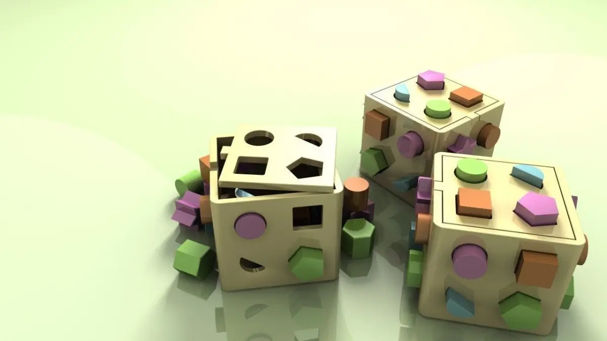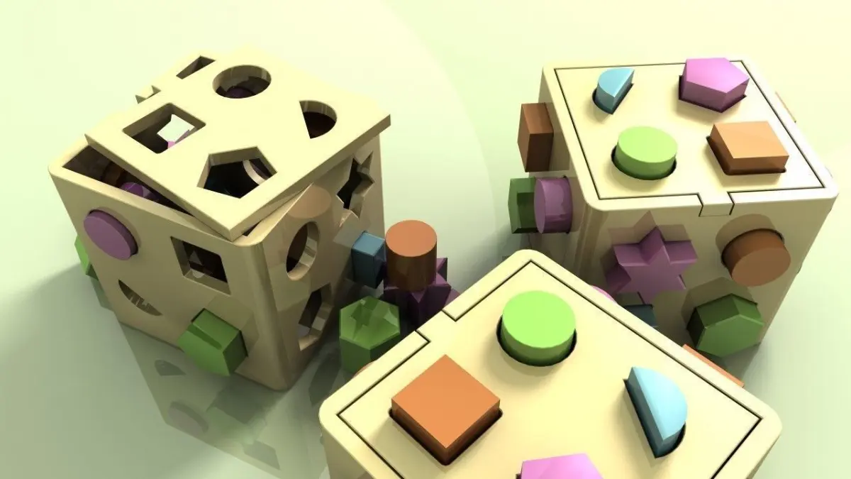 Plastic children's shape sorter box toy. Two models are included, one with all the blocks in place, and one with blocks arranged on floor.The holes have micro bevels in them. Only triangles.