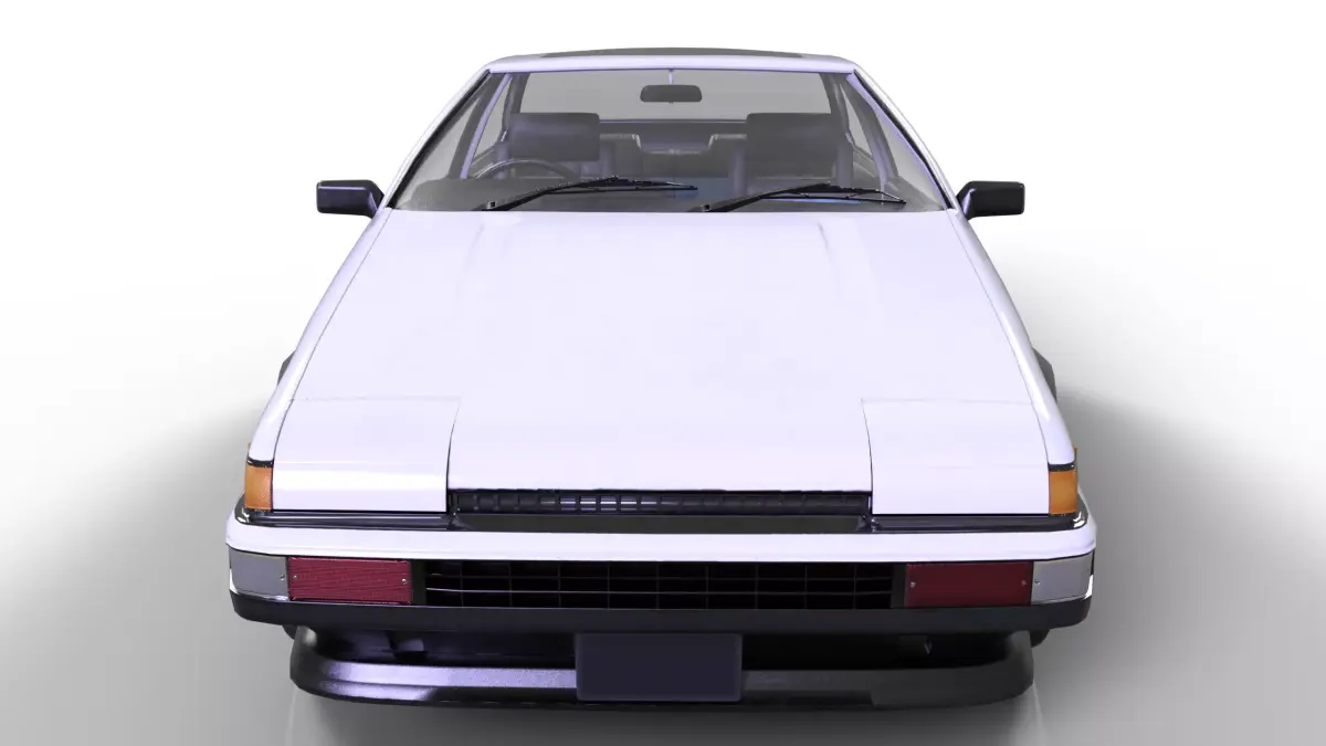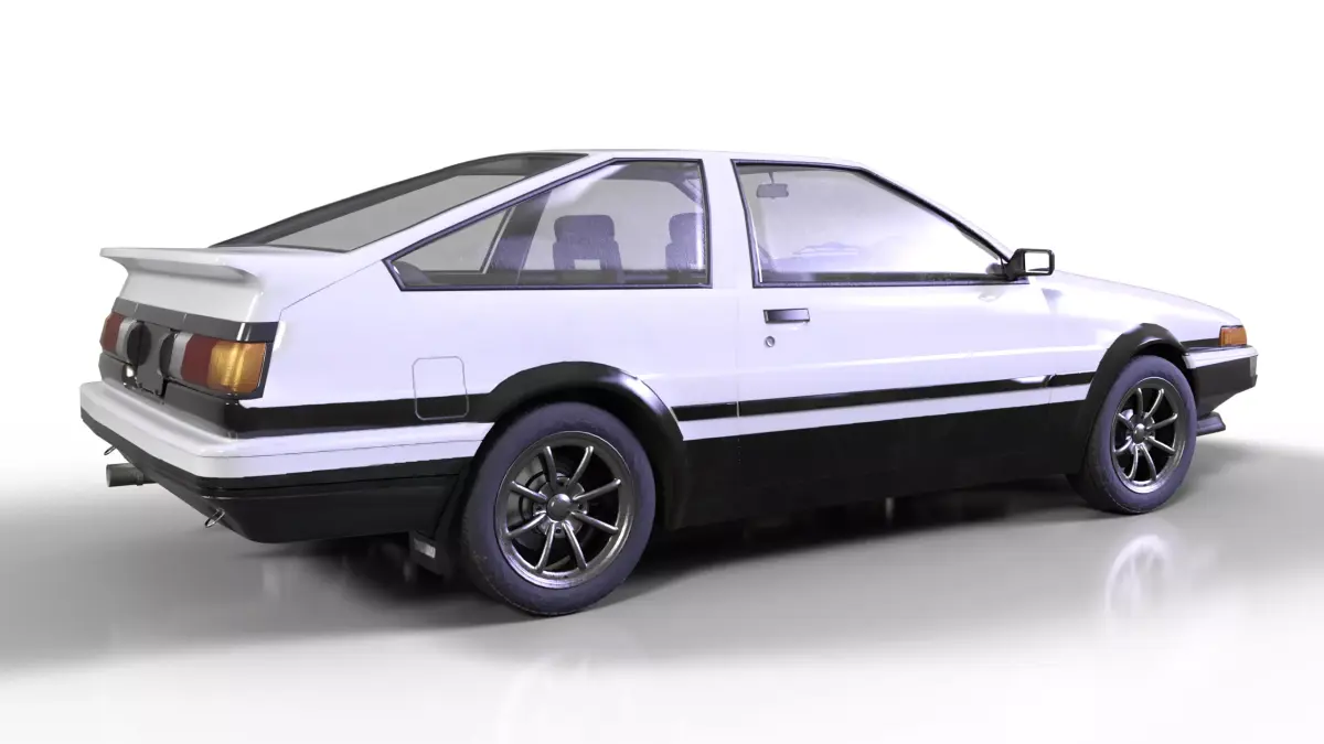 A detailed 3D render of the iconic Toyota AE86 Sprinter Trueno, famous for its timeless design and status as a motorsport legend. The model captures the essence of the car with a clean white finish, closed pop-up headlights, and a design that evokes the nostalgia of 80s Japanese sports cars. Subtle lighting highlights the body lines and glass details.