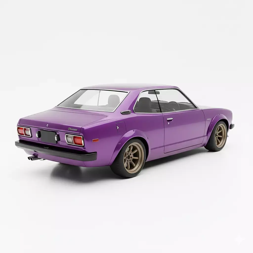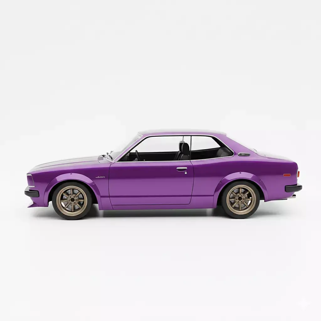 Toyota Corolla or a similar sedan-based coupe from the 1970s. The car is finished in a unique and vibrant metallic purple paint, giving it a distinct show-car appearance. It features popular tuning modifications including a deep front spoiler, subtle fender flares to accommodate the wider stance, and a set of classic multi-spoke bronze-colored deep-dish wheels. The clean rendering, low profile, and stylish modifications make this model excellent for use in racing games, automotive enthusiast scenes, or detailed JDM-themed virtual environments.