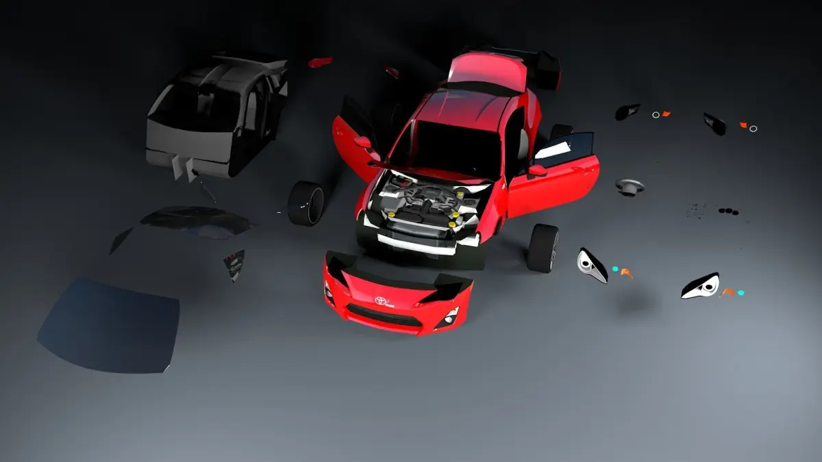 The model has some separate modules:Hood, Trunk, Glass, Wheels, Headlights, Doors, Bumpers, Salon, Steering wheel